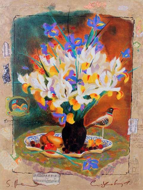 Artist: Alexander & Wissotzky - Title: Iris Bouquet III - Medium: Serigraph on Wood - Signature: Hand-signed by the Artist - Limited Edition: 95 - Image Size: Approximately 19 inches x 14 inches - Unframed - Details: This work comes with a Certificate of Authenticity - The work of Alexander and Wissotzky has received critical acclaim and success in both Israel and abroad and can be found in public and private collections all over the world. Sadly, Tanya Wissotzky lost her battle with cancer in November of 2006.Alexander Galtchansky has also passed away just a few years later.