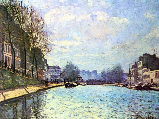 Artist: Alfred Sisley - Title: Canal of Saint-Martin - Medium: Fine Art Reproduction Giclee on Canvas - Image Size: Approximately 14.75 inches x 20 inches - Unframed on Unstretched Canvas - Biography: Alfred Sisley was an Impressionist landscape painter who was born and spent most of his life in France, but retained British citizenship. He was the most consistent of the Impressionists in his dedication to painting landscape en plein air.