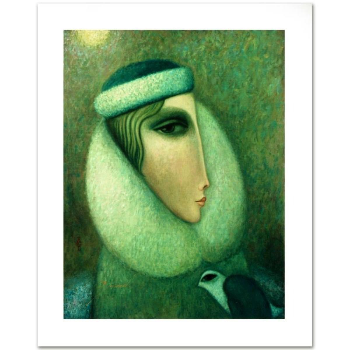 Alina by Smirnov, Sergey. Combining time-honored religious icon painting with western style portraiture, the hauntingly beautiful art of Sergey Smirnov (1953-2006) is inspired by the 'Parsuna' art movement. "Alina" is a limited edition mixed media on canvas, printed in 2006, numbered in verso and hand signed by the artist. Includes Certificate of Authenticity! Measures approx. 13" x 17" (image).