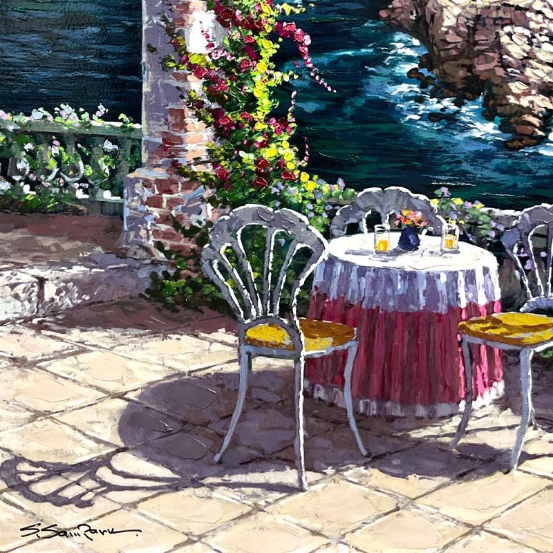 "Amalfi Vista" is a hand embellished limited edition printer's proof on stretched canvas by Sam Park, numbered and hand signed by the artist. Includes Letter of Authenticity. Measures approx. 30" x 24" (image). There is minor wear on the corners and edges (chipping and/or hairline cracks) that will be concealed when framed.