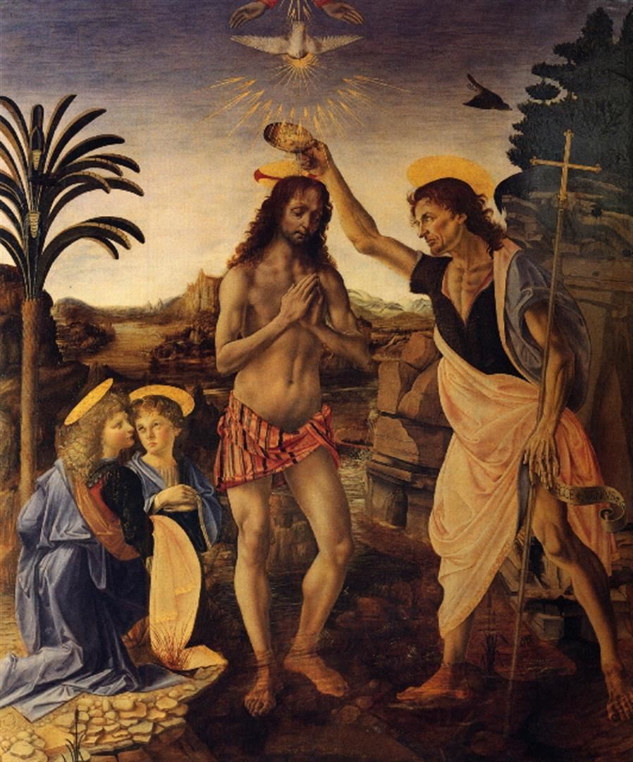 Artist:Andrea del Verrocchio - Title: Baptism of Christ - Medium: Fine Art Giclee on Canvas - Image Size: Approximately 32 inches x 26.5 inches - Unframed on Unstretched Canvas - Biography: Andrea del Verrocchio (c. 1435 - 1488), born Andrea di Michele di Francesco de' Cioni, was an Italian painter, sculptor, and goldsmith who was a master of an important workshop in Florence. He apparently became known as Verrocchio after the surname of his master, a goldsmith. Few paintings are attributed to him with certainty, but a number of important painters were trained at his workshop. His pupils included Leonardo da Vinci, Pietro Perugino and Lorenzo di Credi. His greatest importance was as a sculptor and his last work, the Equestrian statue of Bartolomeo Colleoni in Venice, is generally accepted as a masterpiece. "Baptism of Christ" is a painting finished around 1475 in the studio of the Italian Renaissance painter Andrea del Verrocchio and generally ascribed to him and his pupil Leonardo da Vinci. Some art historians discern the hands of other members of Verrocchio's workshop in the painting as well.