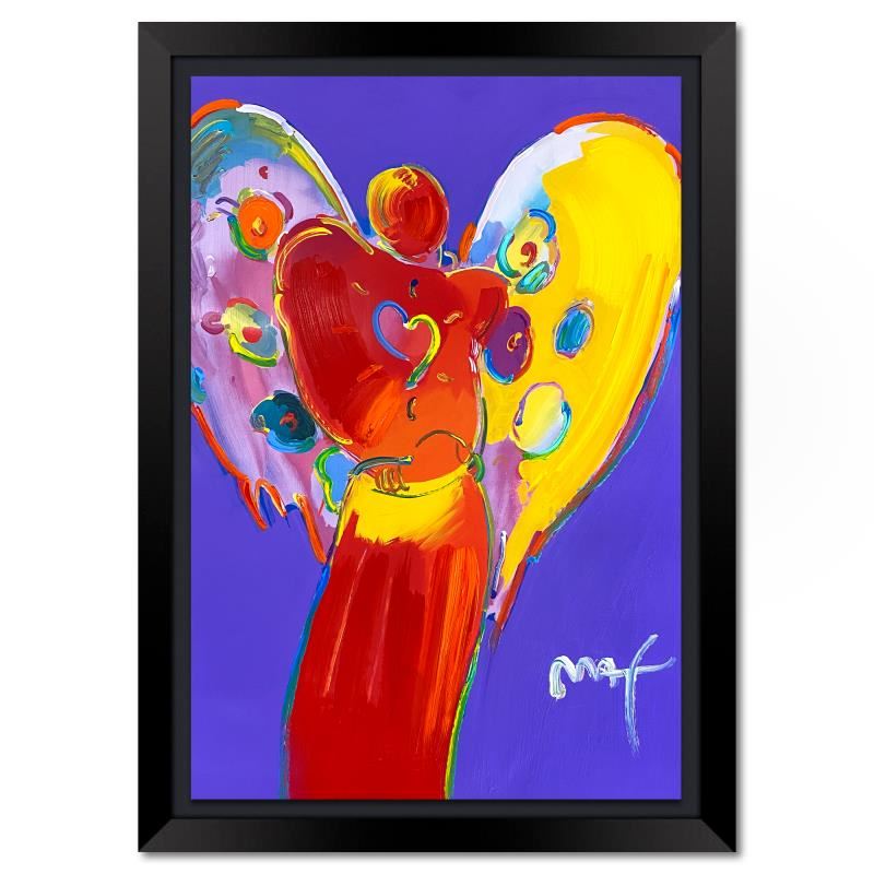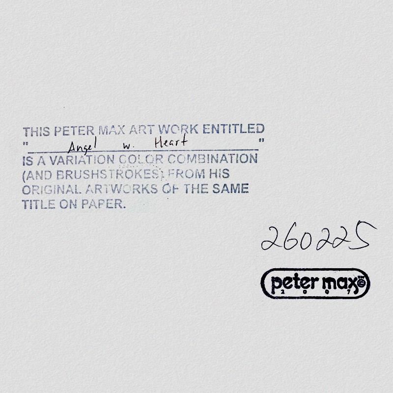 "Angel with Heart" is a one-of-a-kind mixed media on paper, hand signed by Peter Max. The piece comes custom framed with a backside cutout to display Peter Max Studio registration number 260225 certifying authenticity. Measures approximately 42" x 30" (frame), 36" x 24" (image). This item requires special handling and may have a longer than usual turnaround.