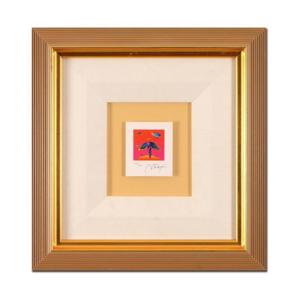 "Angel with Saturn" is a limited edition lithograph on paper by Peter Max, numbered 457/500 and hand signed by the artist. This piece comes framed and includes Certificate of Authenticity. Measures approximately 15.5" x 15" (frame), 3.5" x 3" (image).