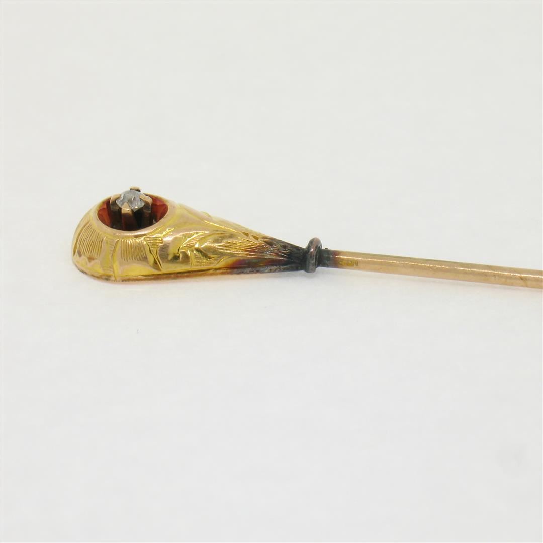 An antique solid 10k yellow gold stick pin brooch, featuring 1 old mine cut natural diamond (H- SI2; 0.04ct ). Measures 68.0x7.20mm and weighs a total of 1.03 grams.