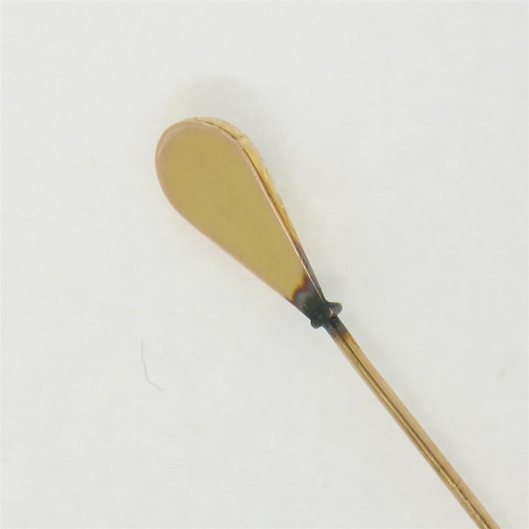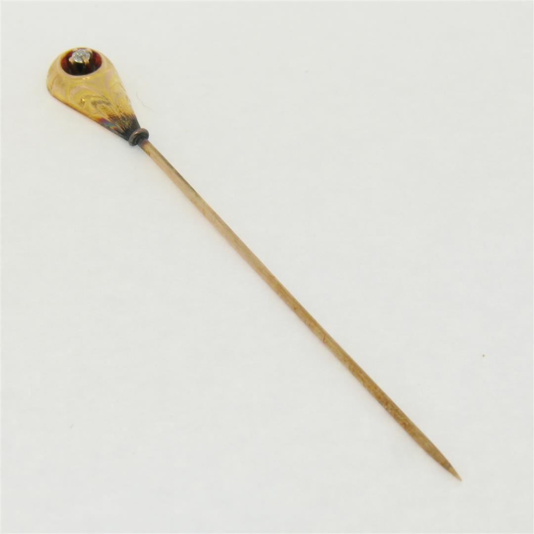 An antique solid 10k yellow gold stick pin brooch, featuring 1 old mine cut natural diamond (H- SI2; 0.04ct ). Measures 68.0x7.20mm and weighs a total of 1.03 grams.