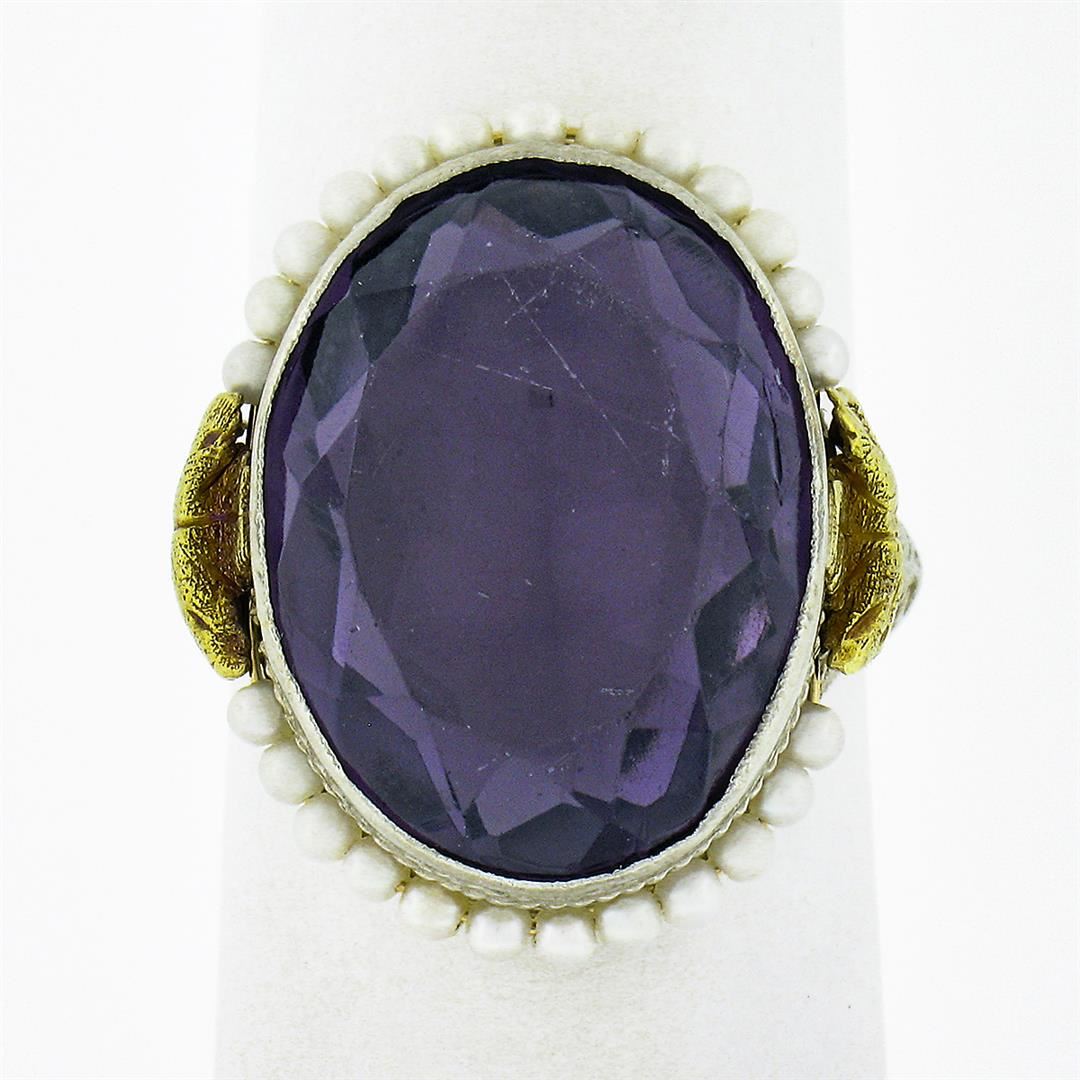 An antique solid 10k yellow & white gold filigree ring, with 1 oval brilliant cut purple stone (17.6x13.3mm ), surrounded with 25 round shape cultured seed pearls (1.75mm each). The ring is size 6.0, weighs a total of 5.33 grams, and measures 21.60mm wide