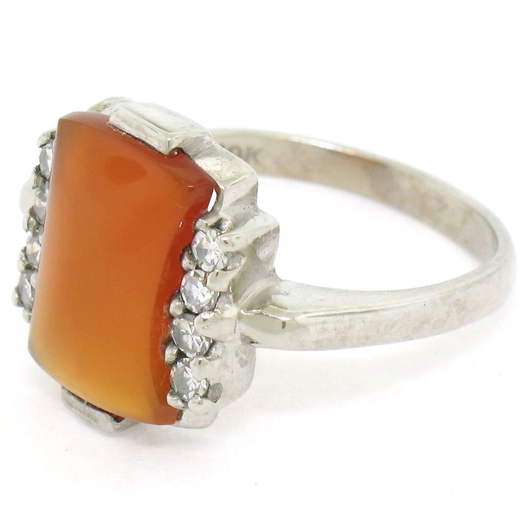 One Antique 10K White Gold Carnelian Solitaire Ring w/ .22ctw Round Diamond Accents. Item Details: Material: 10K Solid White Gold, Weight: 3.14 Grams, Stone(s): (1) Natural Genuine Carnelian - Hourglass Cabochon Cut - Bar Set - Rich Red-Orange Color - 11.60x6.87mm / 1.74ct (approx.), (8) Natural Genuine Diamonds - Round Single Cut - Prong Set - VS1 Clarity - F Color - 0.22ctw (approx.), Total Carat Weight: 1.96 (approx.), Ring Size: 6 , Ring Width: 13.67mm, Ring Height: 4.62mm rise off the finger Signature: MARDEN 10K Condition: Antique ring. Excellent, ready to wear condition!
