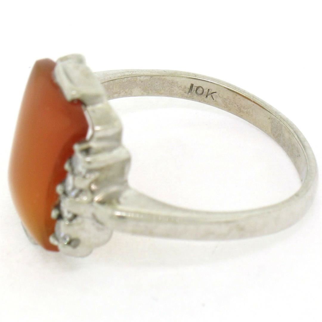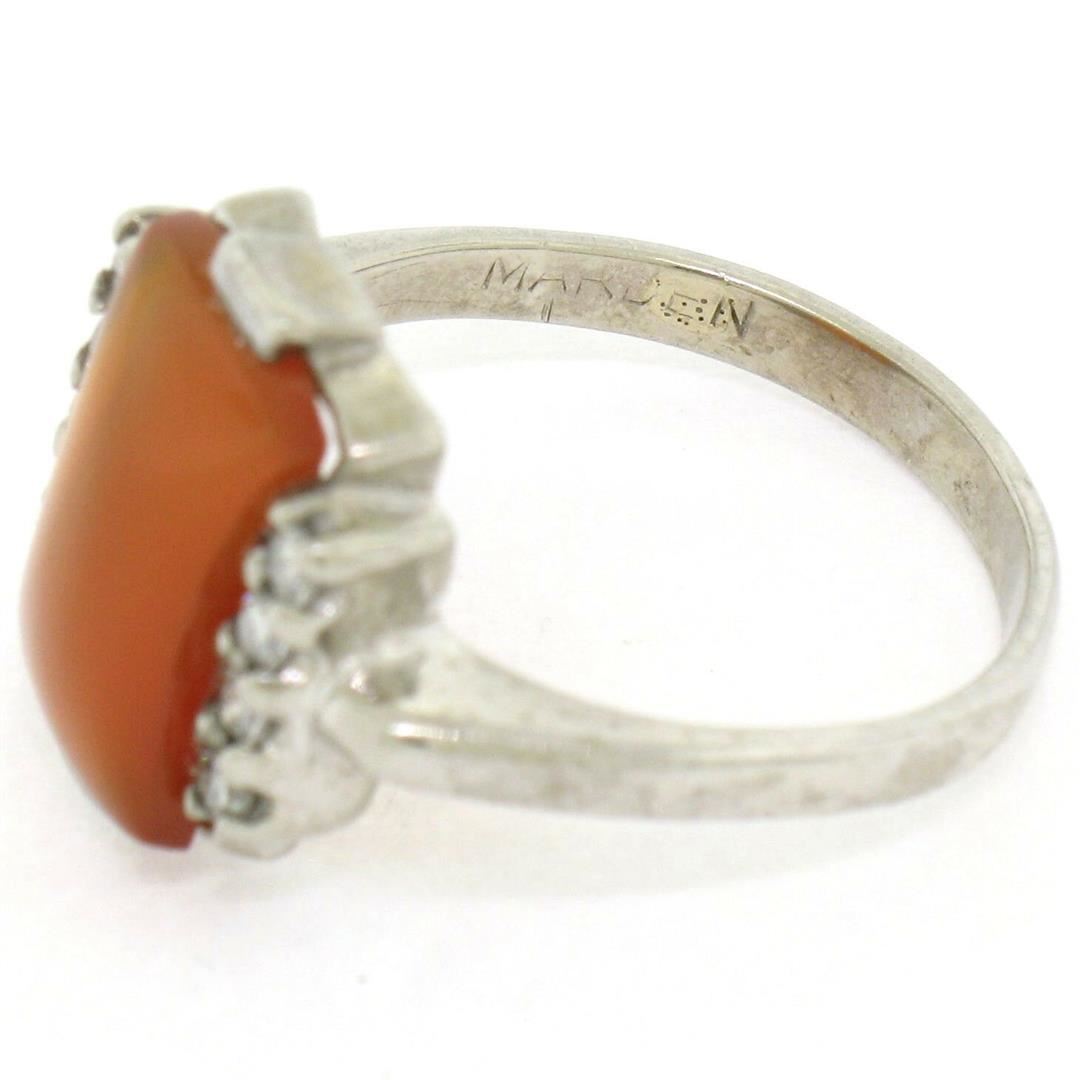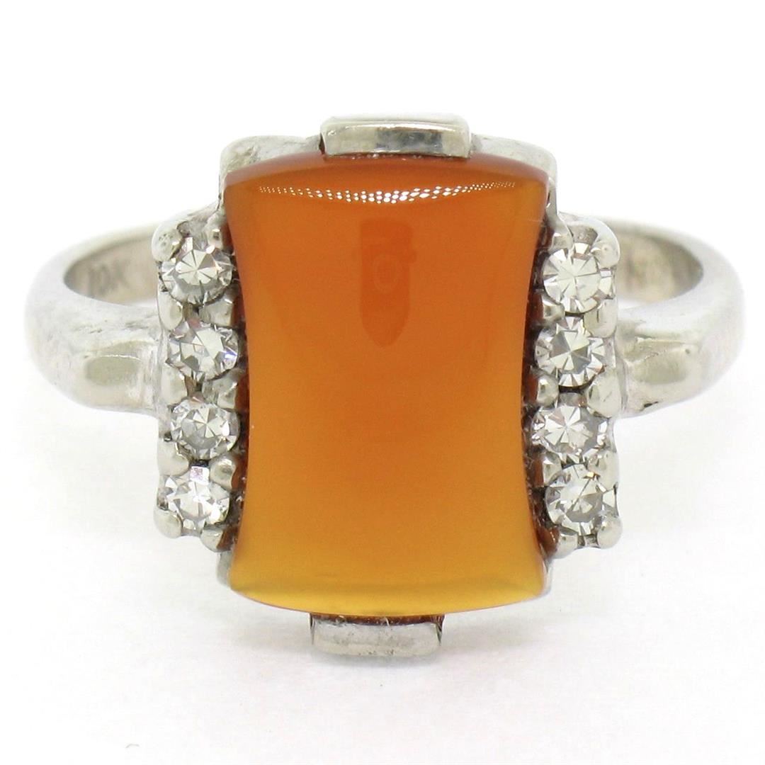 One Antique 10K White Gold Carnelian Solitaire Ring w/ .22ctw Round Diamond Accents. Item Details: Material: 10K Solid White Gold, Weight: 3.14 Grams, Stone(s): (1) Natural Genuine Carnelian - Hourglass Cabochon Cut - Bar Set - Rich Red-Orange Color - 11.60x6.87mm / 1.74ct (approx.), (8) Natural Genuine Diamonds - Round Single Cut - Prong Set - VS1 Clarity - F Color - 0.22ctw (approx.), Total Carat Weight: 1.96 (approx.), Ring Size: 6 , Ring Width: 13.67mm, Ring Height: 4.62mm rise off the finger Signature: MARDEN 10K Condition: Antique ring. Excellent, ready to wear condition!