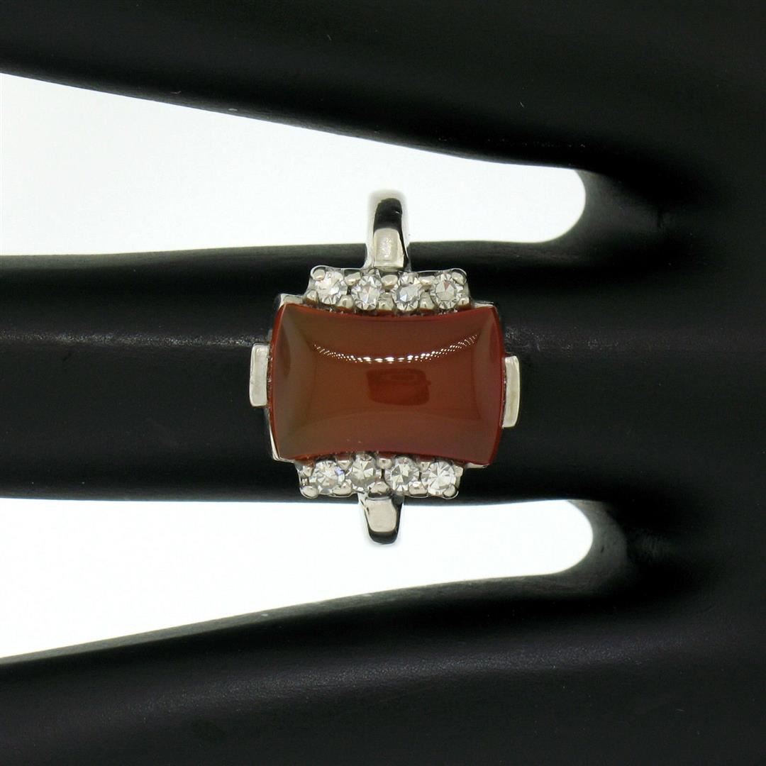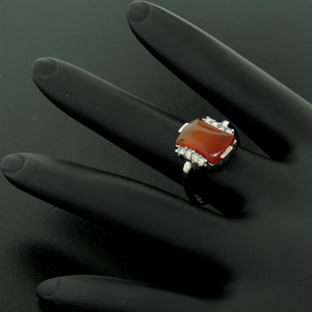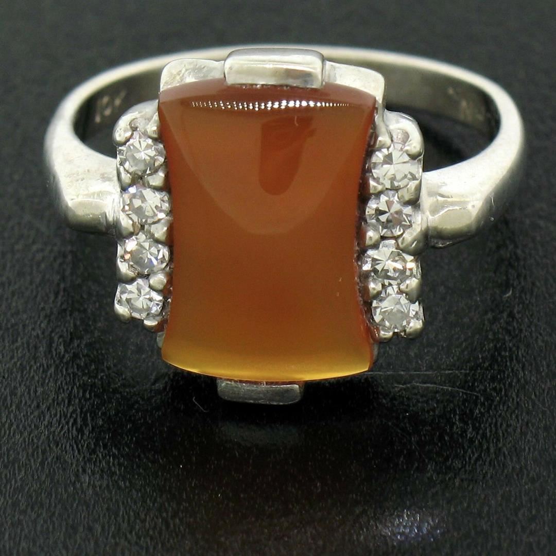 One Antique 10K White Gold Carnelian Solitaire Ring w/ .22ctw Round Diamond Accents. Item Details: Material: 10K Solid White Gold, Weight: 3.14 Grams, Stone(s): (1) Natural Genuine Carnelian - Hourglass Cabochon Cut - Bar Set - Rich Red-Orange Color - 11.60x6.87mm / 1.74ct (approx.), (8) Natural Genuine Diamonds - Round Single Cut - Prong Set - VS1 Clarity - F Color - 0.22ctw (approx.), Total Carat Weight: 1.96 (approx.), Ring Size: 6 , Ring Width: 13.67mm, Ring Height: 4.62mm rise off the finger Signature: MARDEN 10K Condition: Antique ring. Excellent, ready to wear condition!