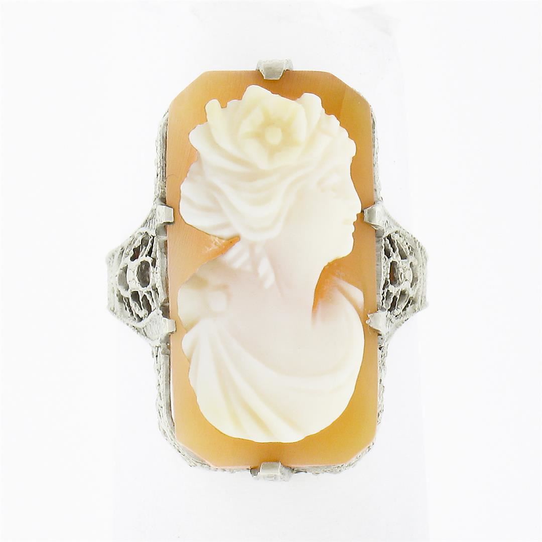 An antique solid 10 white gold ring, with 1 rectangular shape carved cameo shell (18.2x9.55mm).The ring is size 3.0, weighs a total of 2.64 grams, and measures 19.35mm wide.