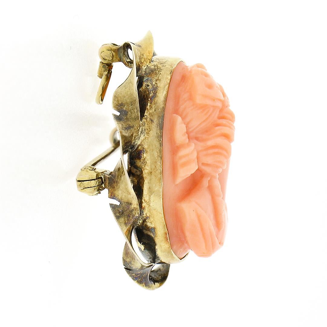 An antique solid 10k yellow gold brooch pendant, with 1 oval shape carved cameo natural coral (19.85x14.75mm). Measures 29.0x20.65mm and weighs a total of 4.59 grams.