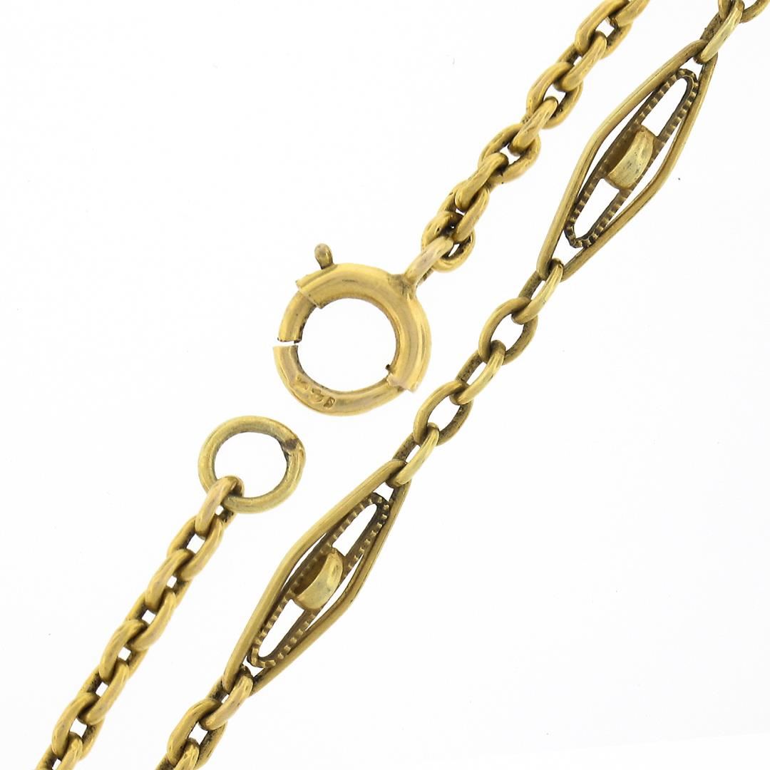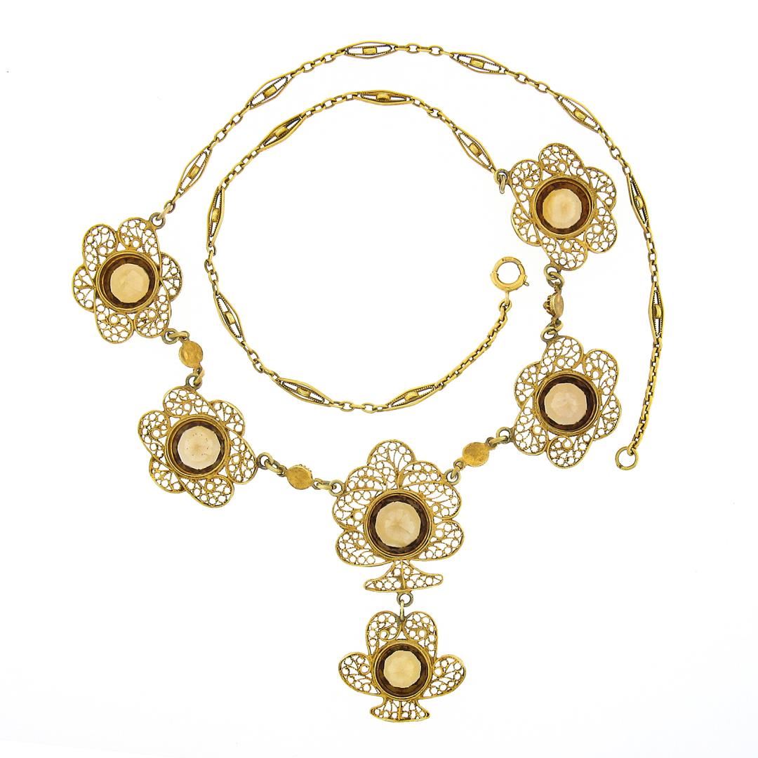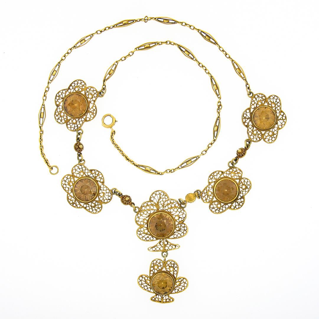 An antique solid 14k yellow gold necklace, with 6 GIA graded round brilliant cut natural zircon (21.40ctw). It weighs a total of 16.74 grams, measures 5.5 inches wide, and measures 17 inches in length. Comes with all original relevant certifications.