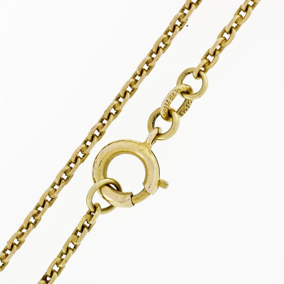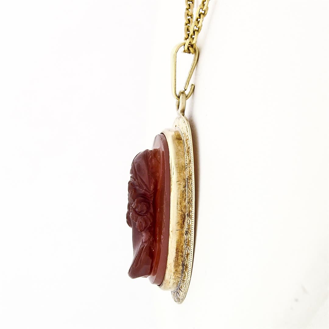 An antique solid 14k yellow gold pendant necklace, with 1 oval shape natural carved cameo carnelian (20.6x15.5mm). The pendant weighs a total of 9.57 grams, measures 35.1x20.5mm including the bail, and 20 inch cable link chain.