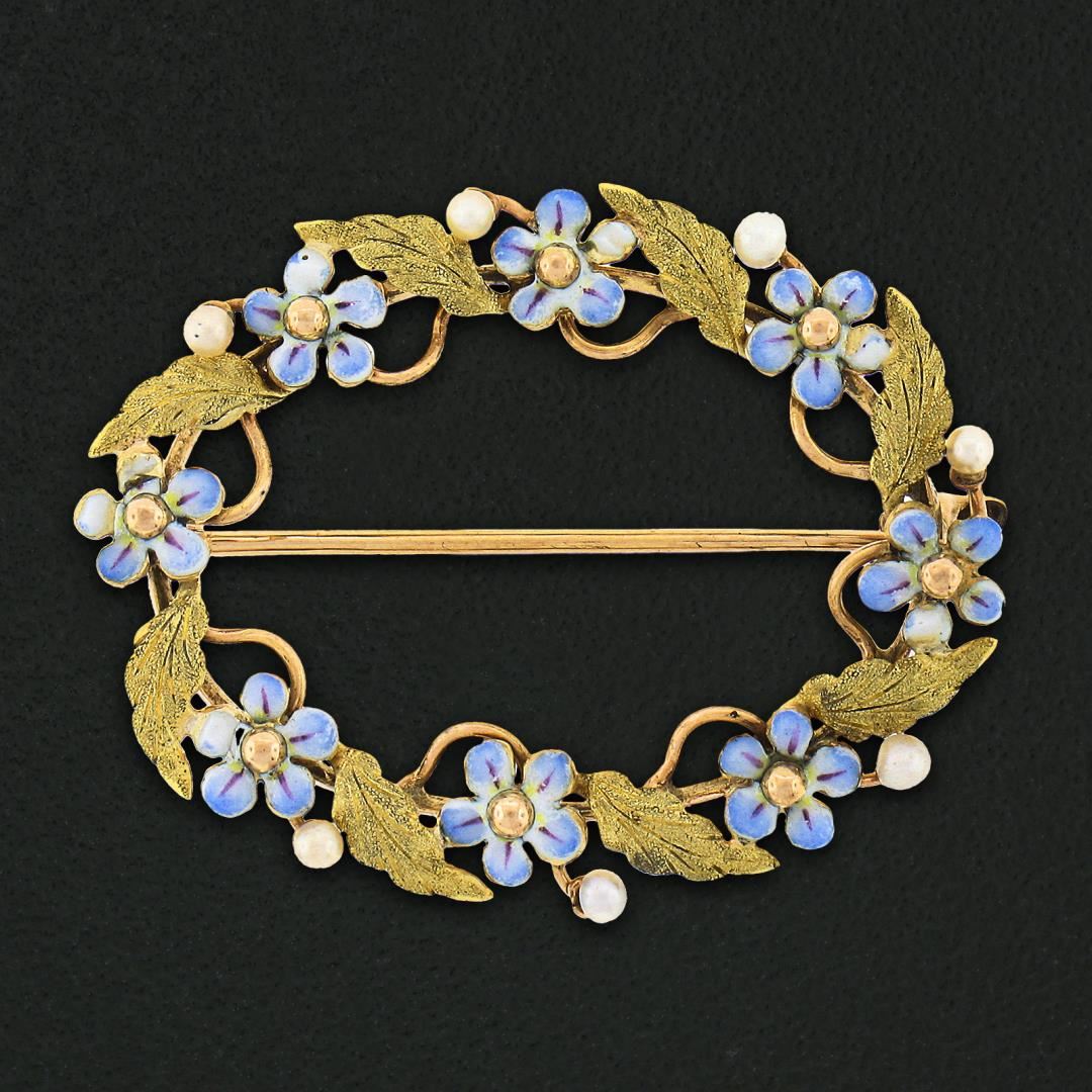 An antique solid 14k yellow gold and enamel wotk floral brooch, with 7 round shape cultured seed pearls (2.3mm each). Measures 29.40x37.10mm and weighs a total of 4.92 grams.