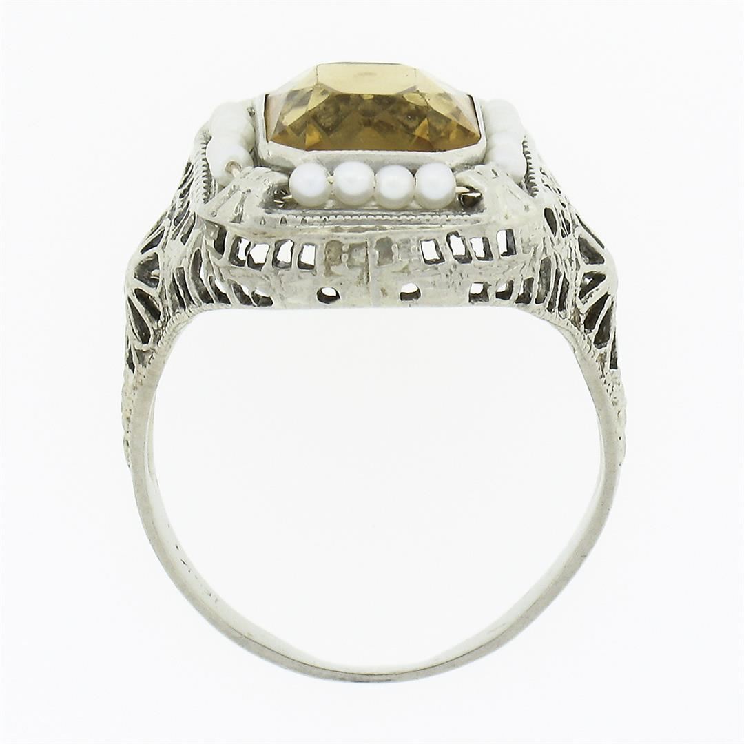An antique solid 14k white gold filigree ring, with rectangular shape natural citrine (9.25x8.1mm), and 19 round shape cultured seed pearls (1.5mm). The ring is size 7.0, weighs a total of 3.25 grams, and measures 16.55mm wide.