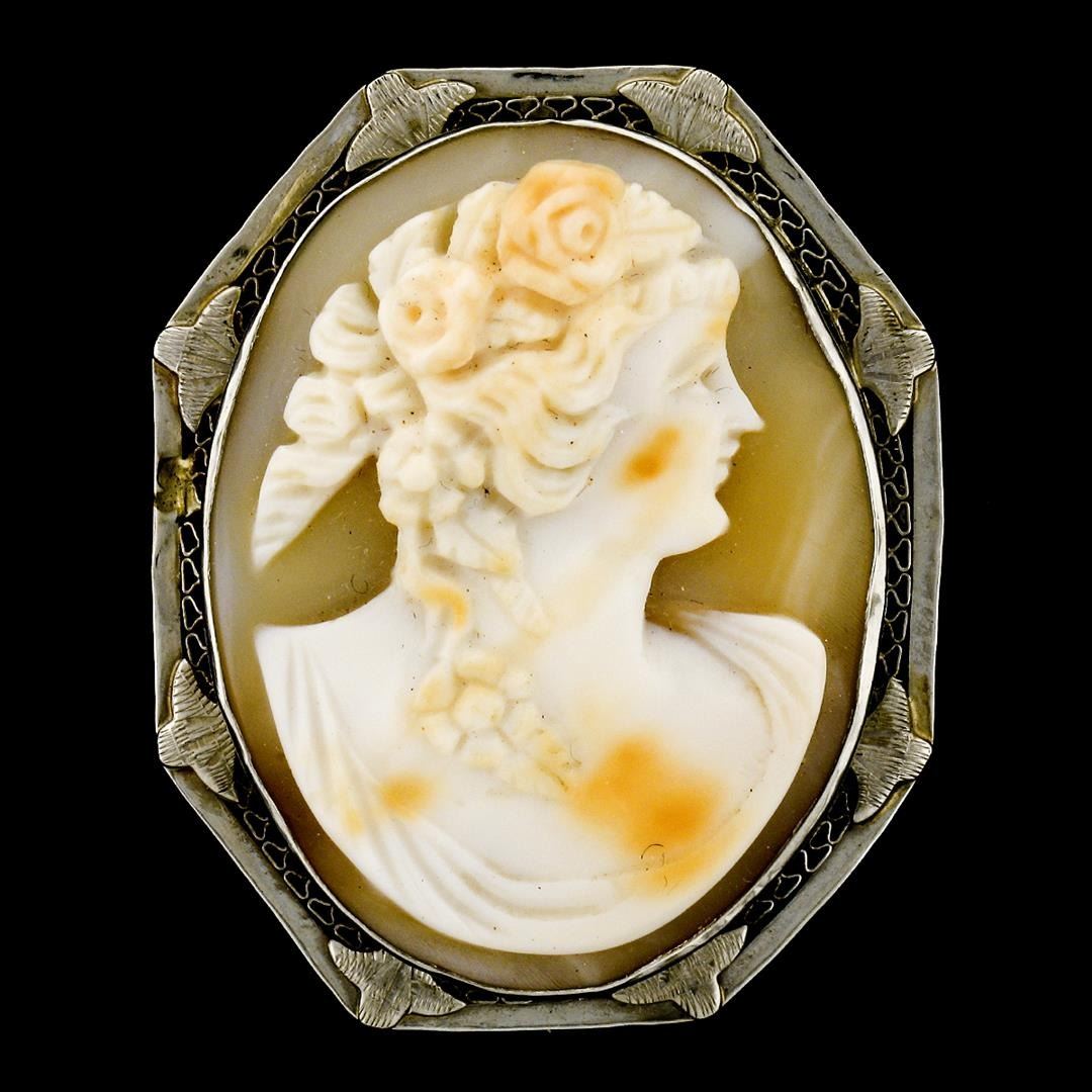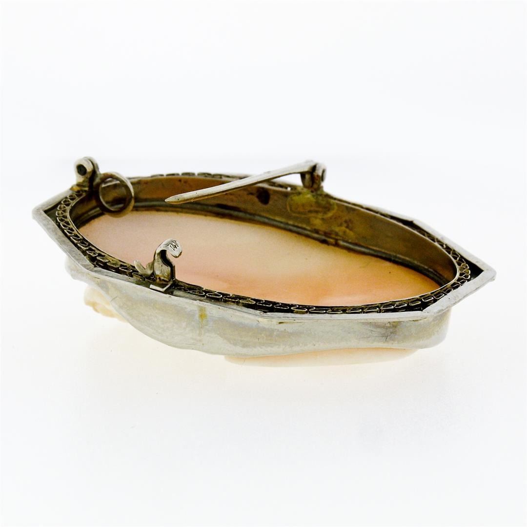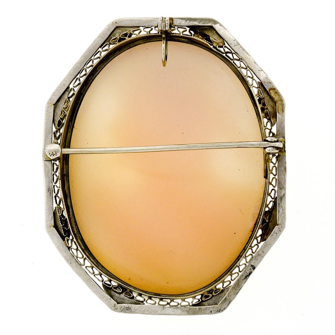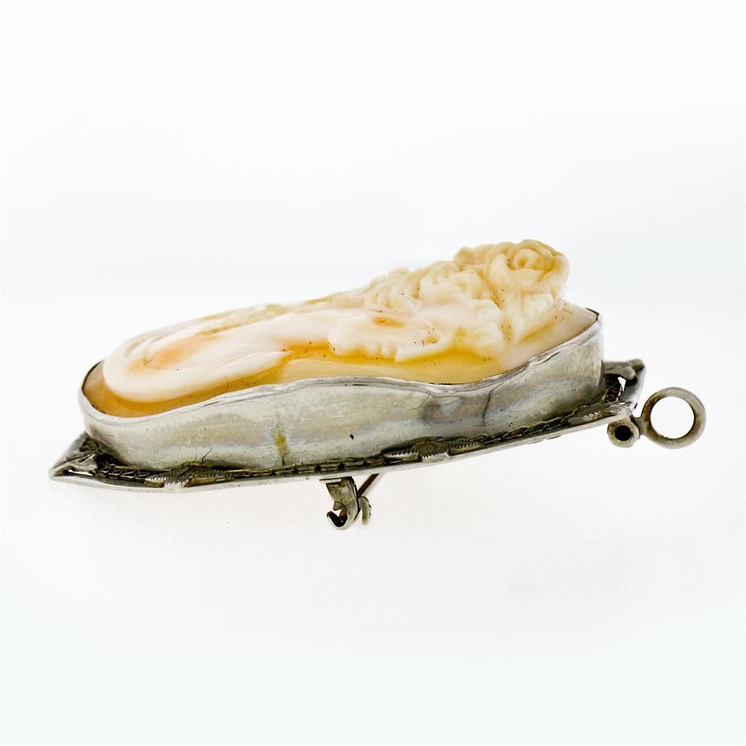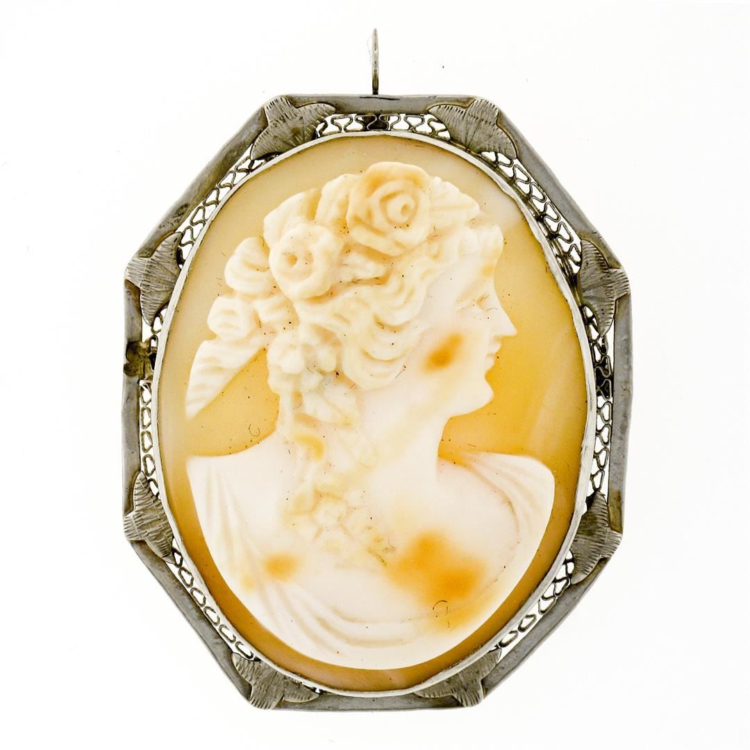 An antique solid 14k white gold brooch pendant, with 1 oval cut cameo carved shell (35.60x27.20mm). Measures 44.10x32.90mm and weighs a total of 10.77 grams.