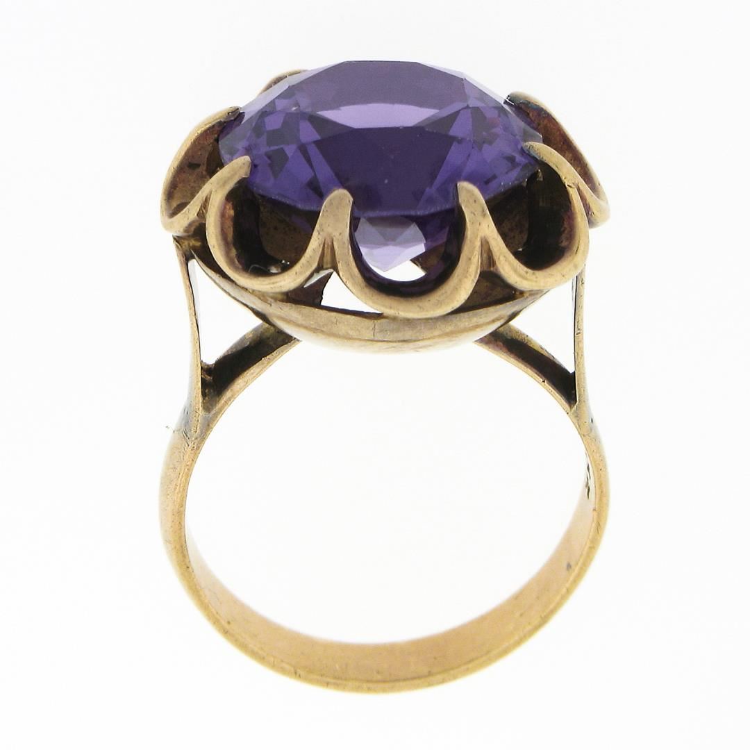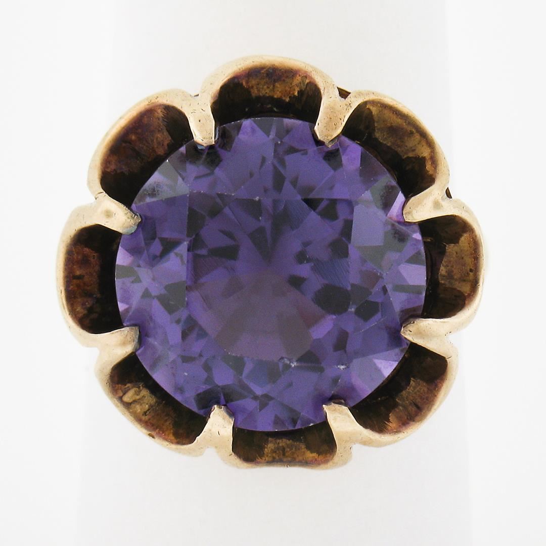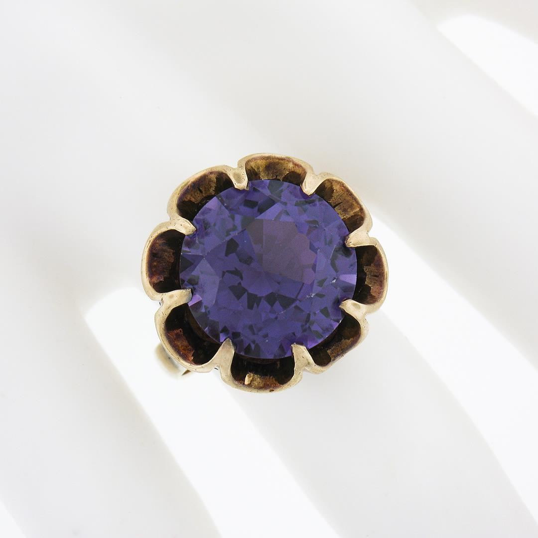 An antique solid 14k yellow gold belcher soliatire ring, with 1 round brilliant cut synthetic alexandrite (13.5mm). The ring is size 6.5, weighs a total of 7.94 grams, and measures 18.60mm wide.
