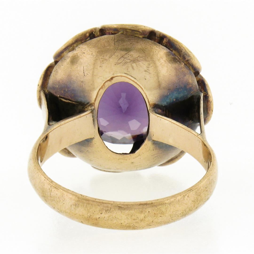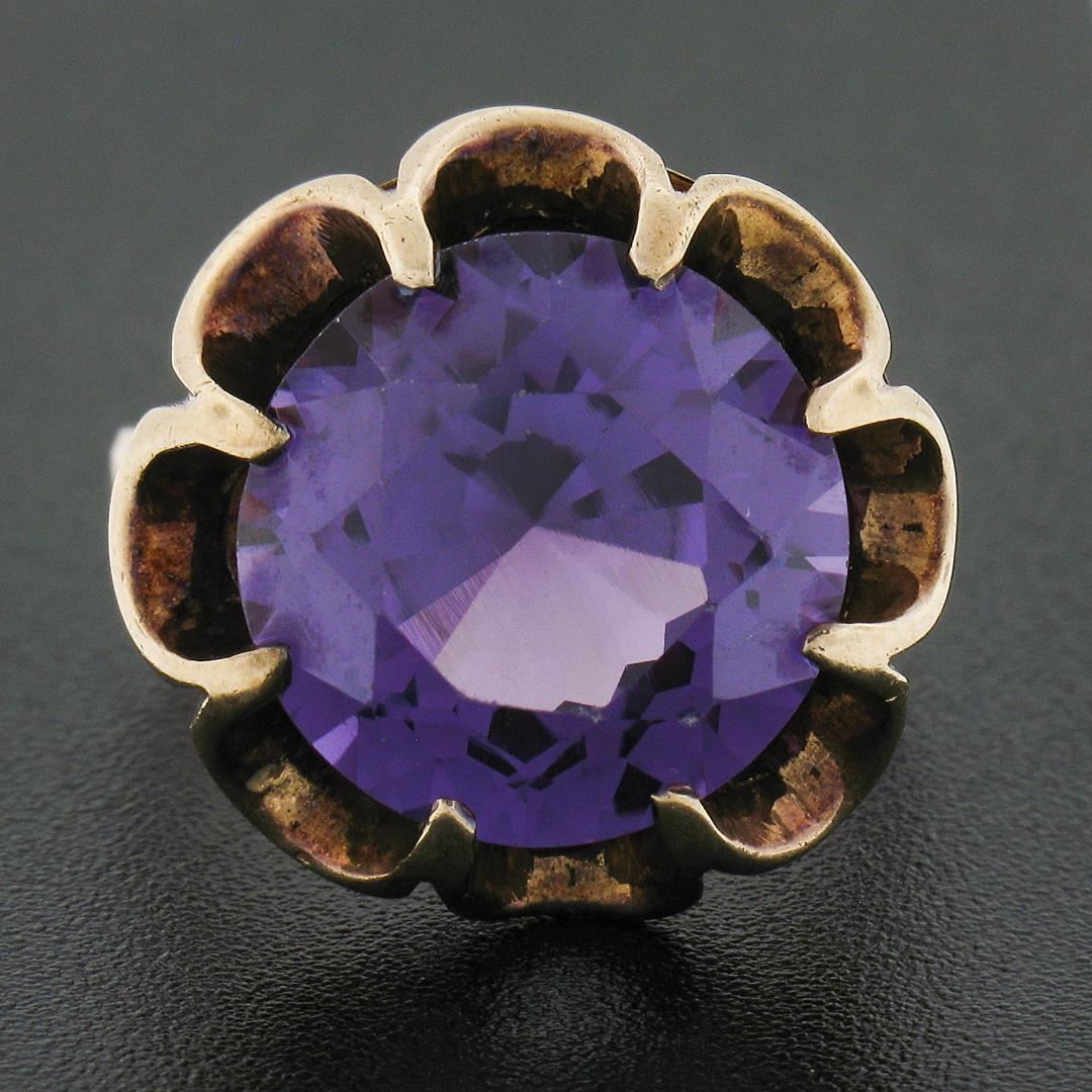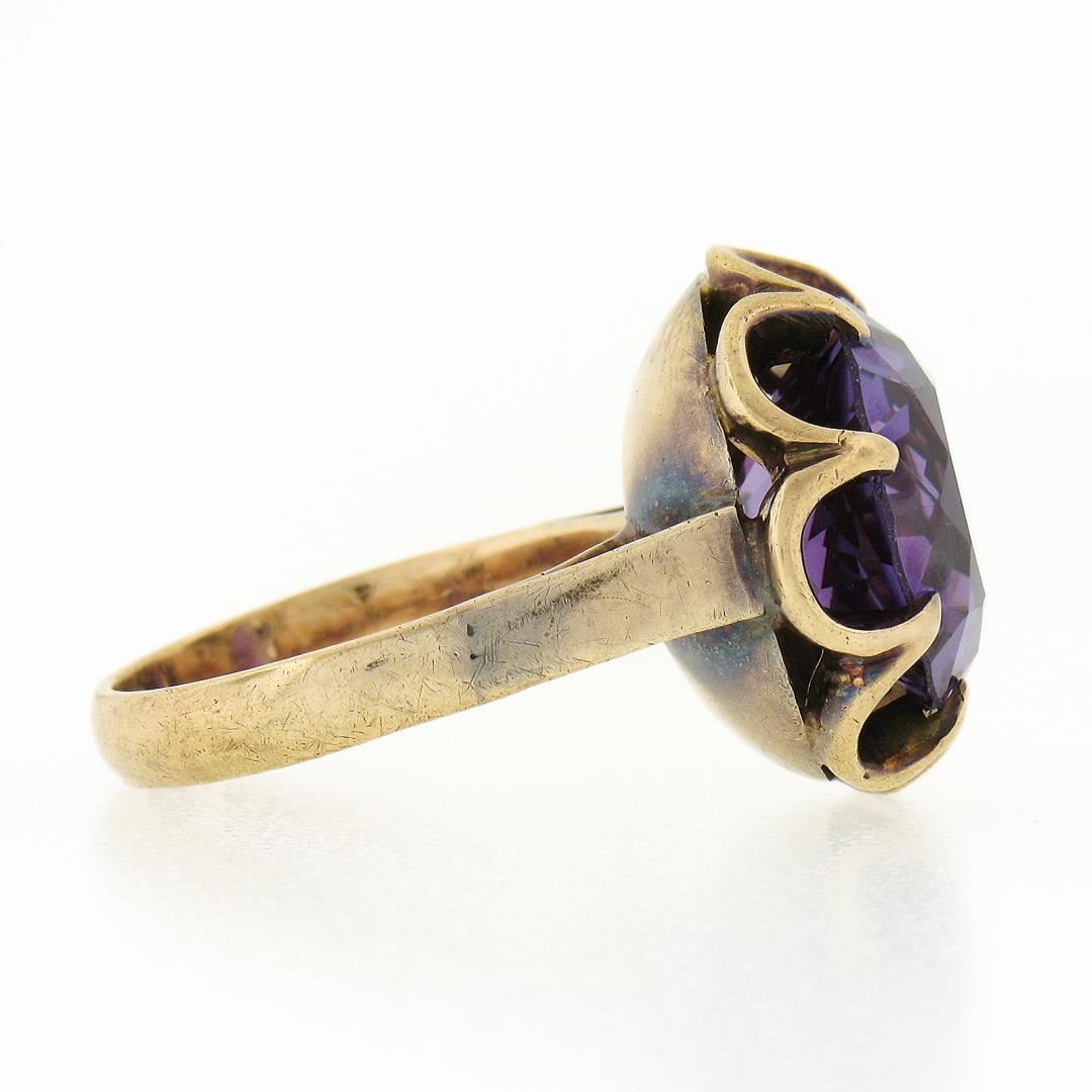An antique solid 14k yellow gold belcher soliatire ring, with 1 round brilliant cut synthetic alexandrite (13.5mm). The ring is size 6.5, weighs a total of 7.94 grams, and measures 18.60mm wide.