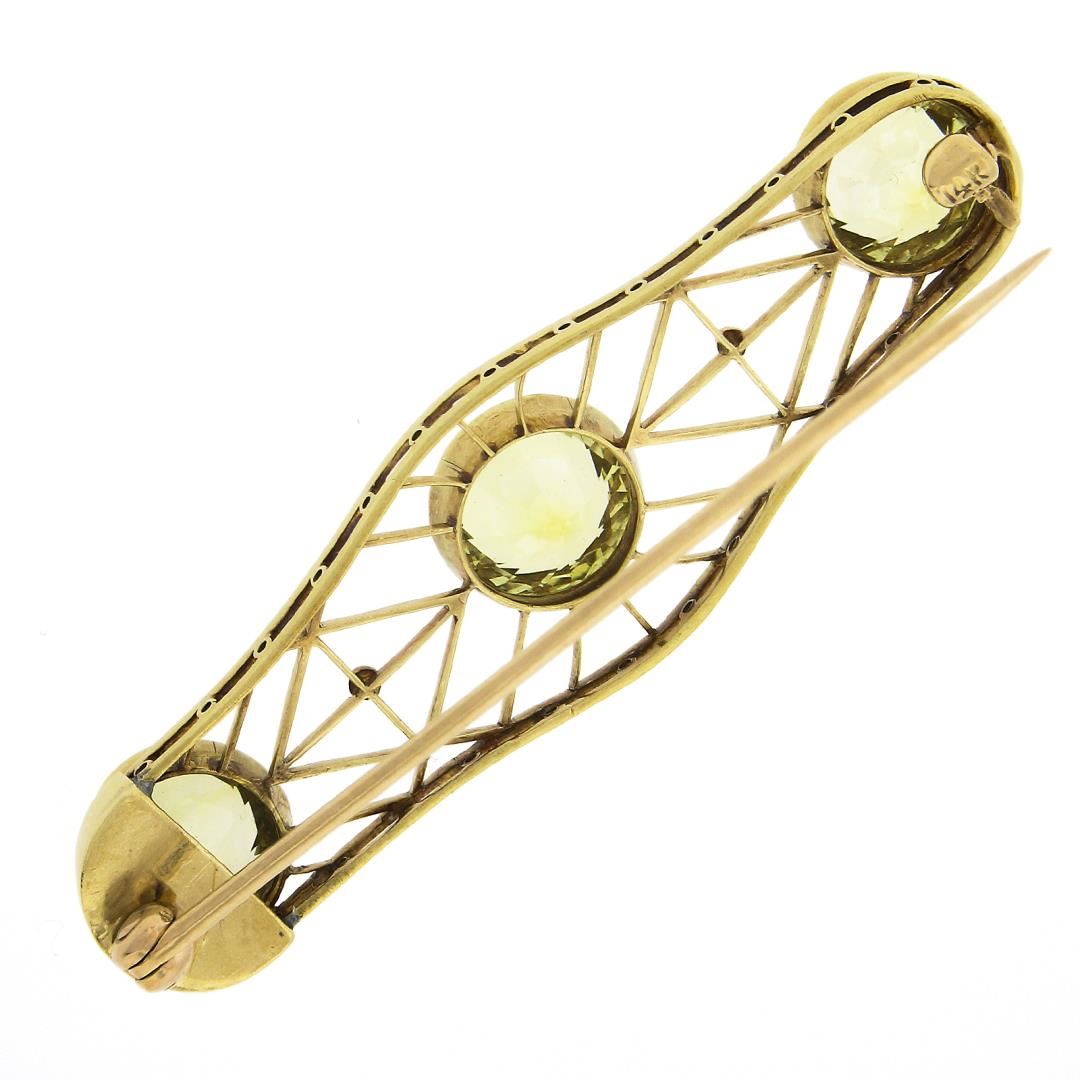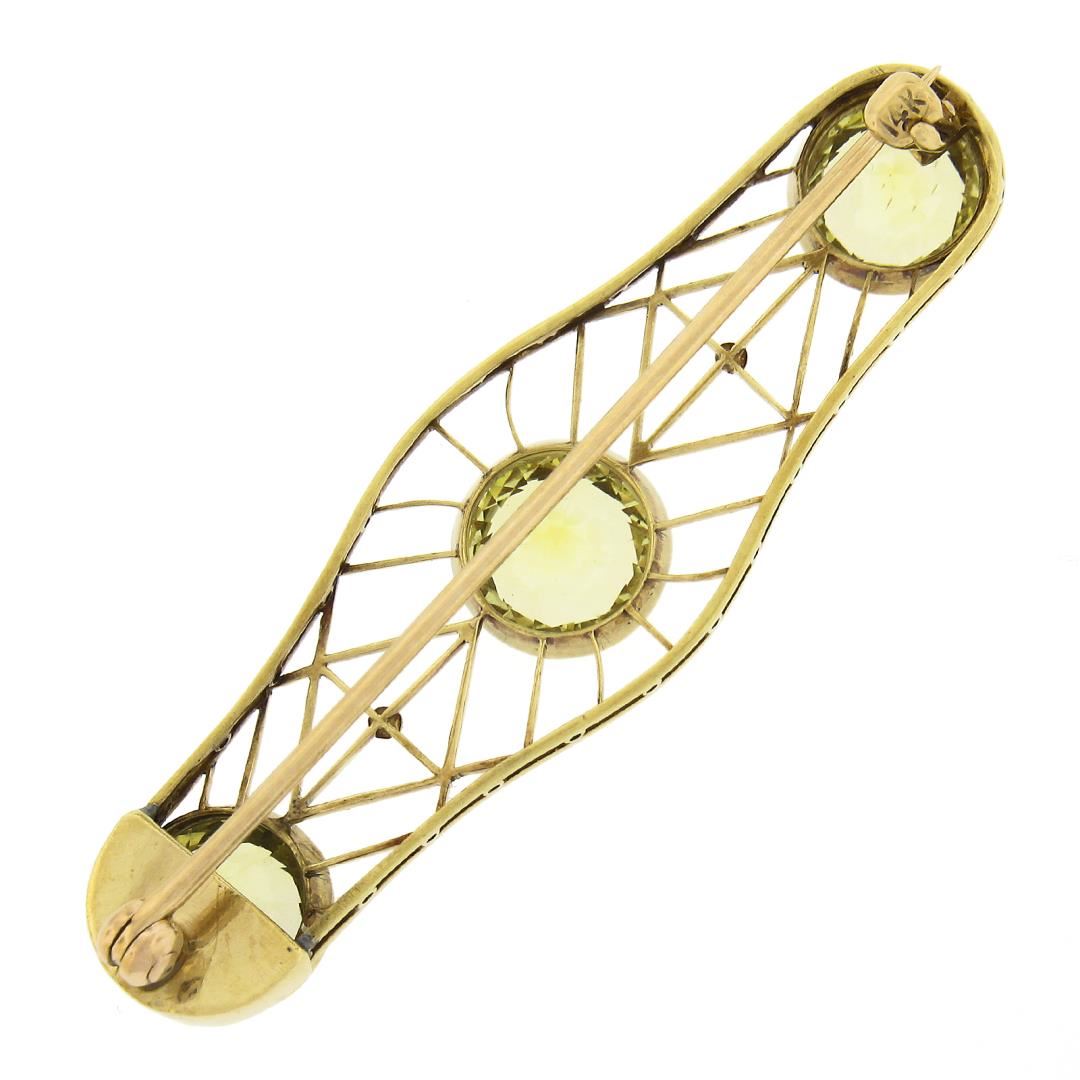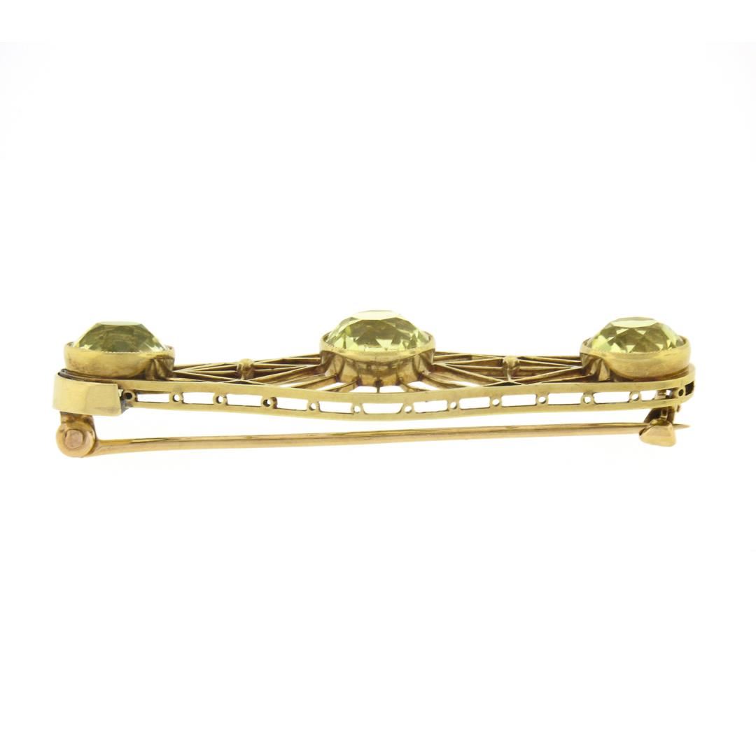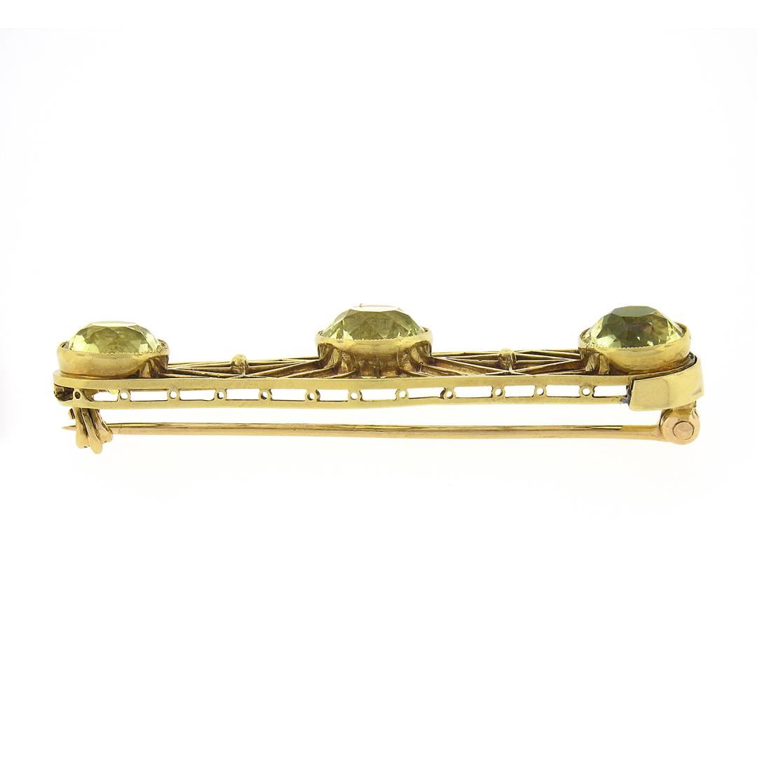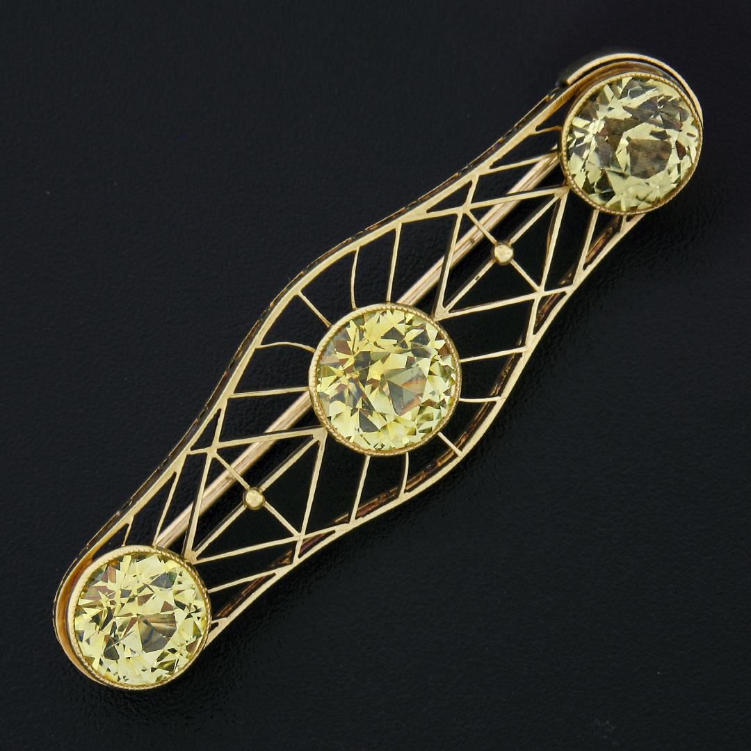An antique solid 14k yellow gold brooch, with 3 GIA graded old european cut synthetic sapphires (9.50ctw). Measures 15x50.70mm and weighs a total of 6.62 grams. Comes with all original relevant certifications.