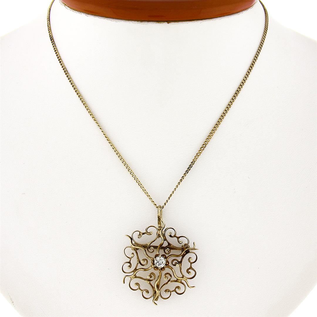 An antique solid 14k yellow gold brooch pendant. with 1 old European cut natural diamond (H- VS1 ; 0.15ct). 16.5 inch curb link chain, 8.30 grams total weight, pendant measures 34.65x25.80mm.