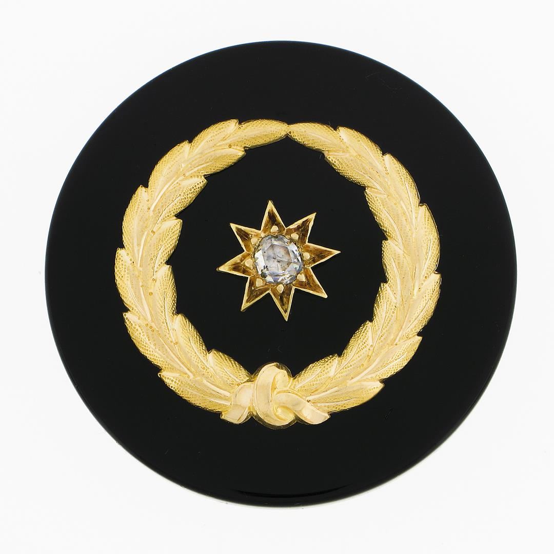 an antique solid 14k yellow gold brooch pendant, with 1 round cut natural black onyx (30.4mm), and 1 old rose cut natural diamond (J/K - I1 ; 0.15ctw). Measures 30.40mm in diameter and weighs a total of 9.0 grams.