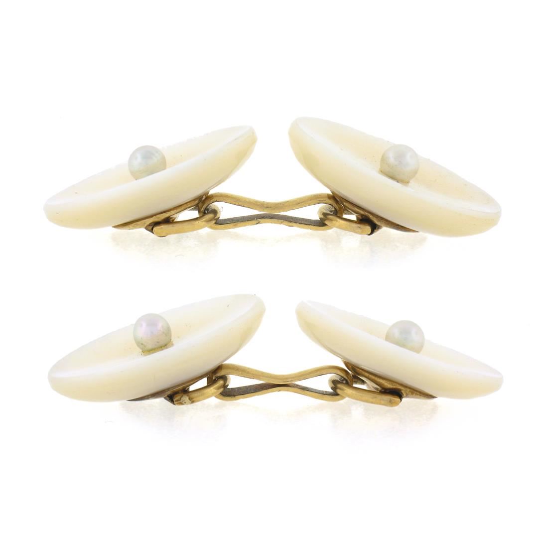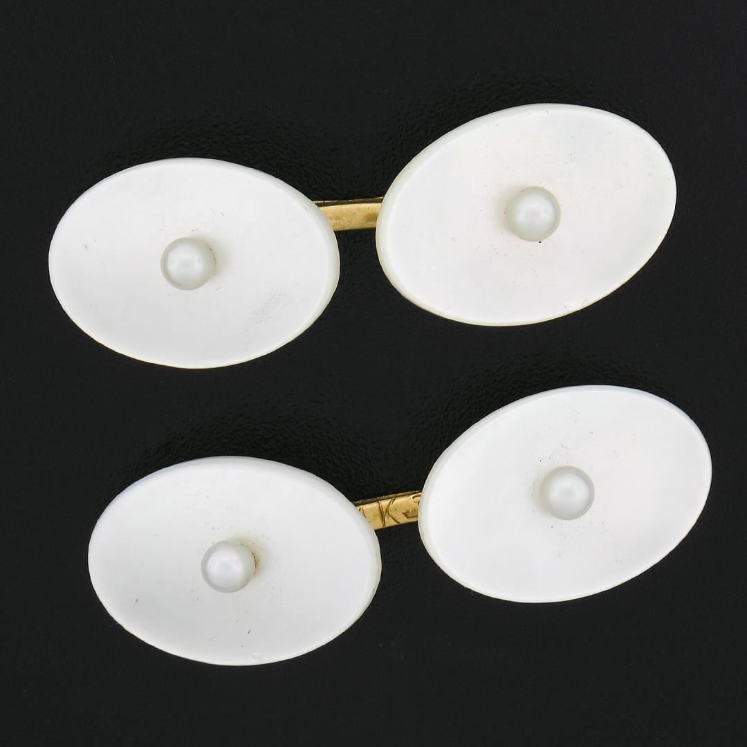 An antique solid 14k yellow gold cufflinks, with 4 oval shape cultured mother of pearls (17.8x11.9mm each), and 4 round shape cultured seed pearls (3mm each). These cuff links have a linking bar design with a clearance of 19.70mm, weigh a total of 7.29 grams, and the front panels measure 17.8x11.9mm.