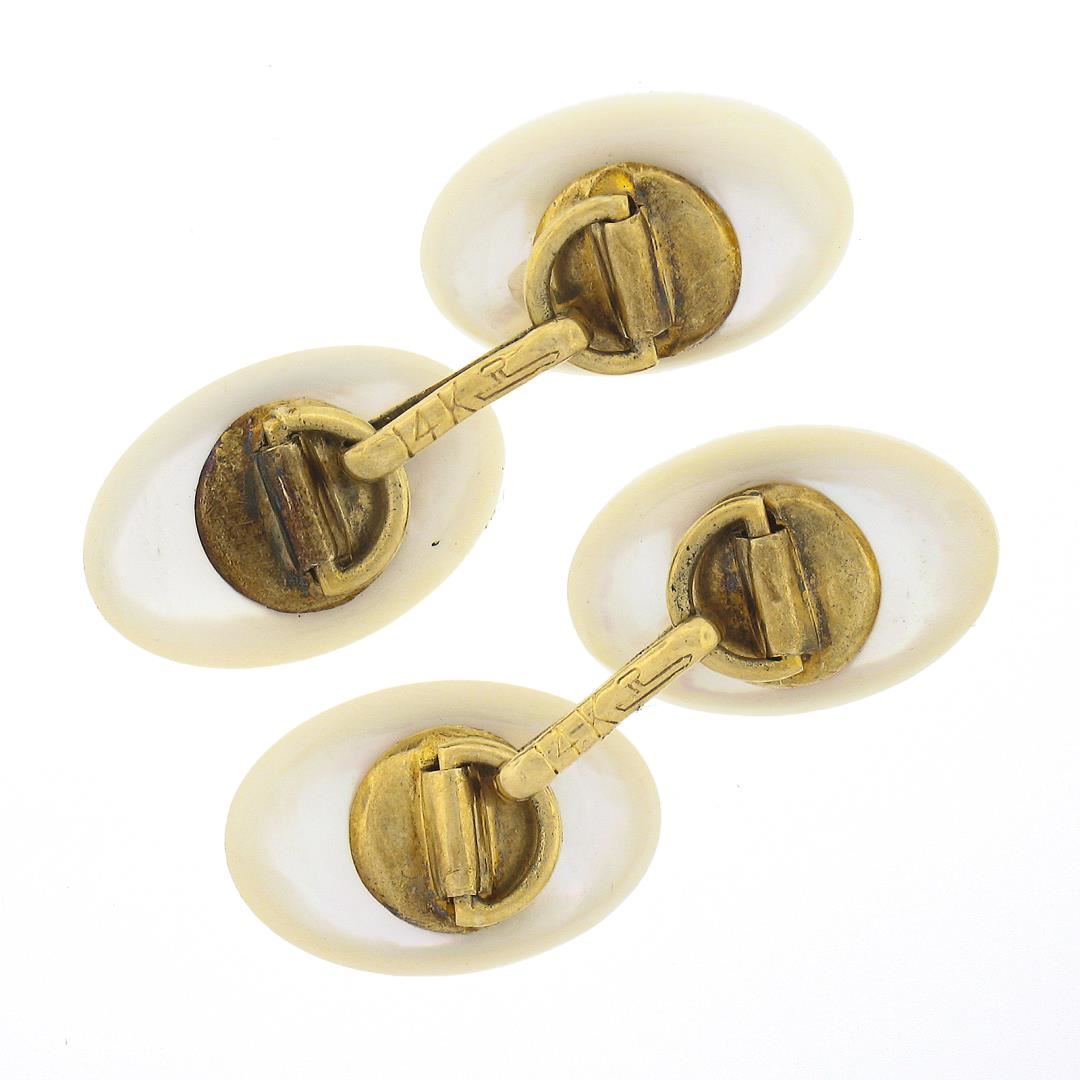 An antique solid 14k yellow gold cufflinks, with 4 oval shape cultured mother of pearls (17.8x11.9mm each), and 4 round shape cultured seed pearls (3mm each). These cuff links have a linking bar design with a clearance of 19.70mm, weigh a total of 7.29 grams, and the front panels measure 17.8x11.9mm.