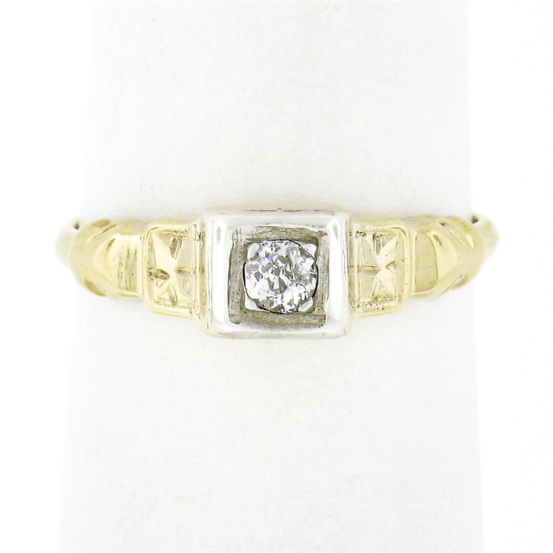 An antique solid 14k yellow and white gold solitaire ring, with 1 old mine cut natural diamond (H- SI2; 0.10ct). The ring is size 5.5, weighs a total of 2.24 grams, and measures 5.25mm wide.