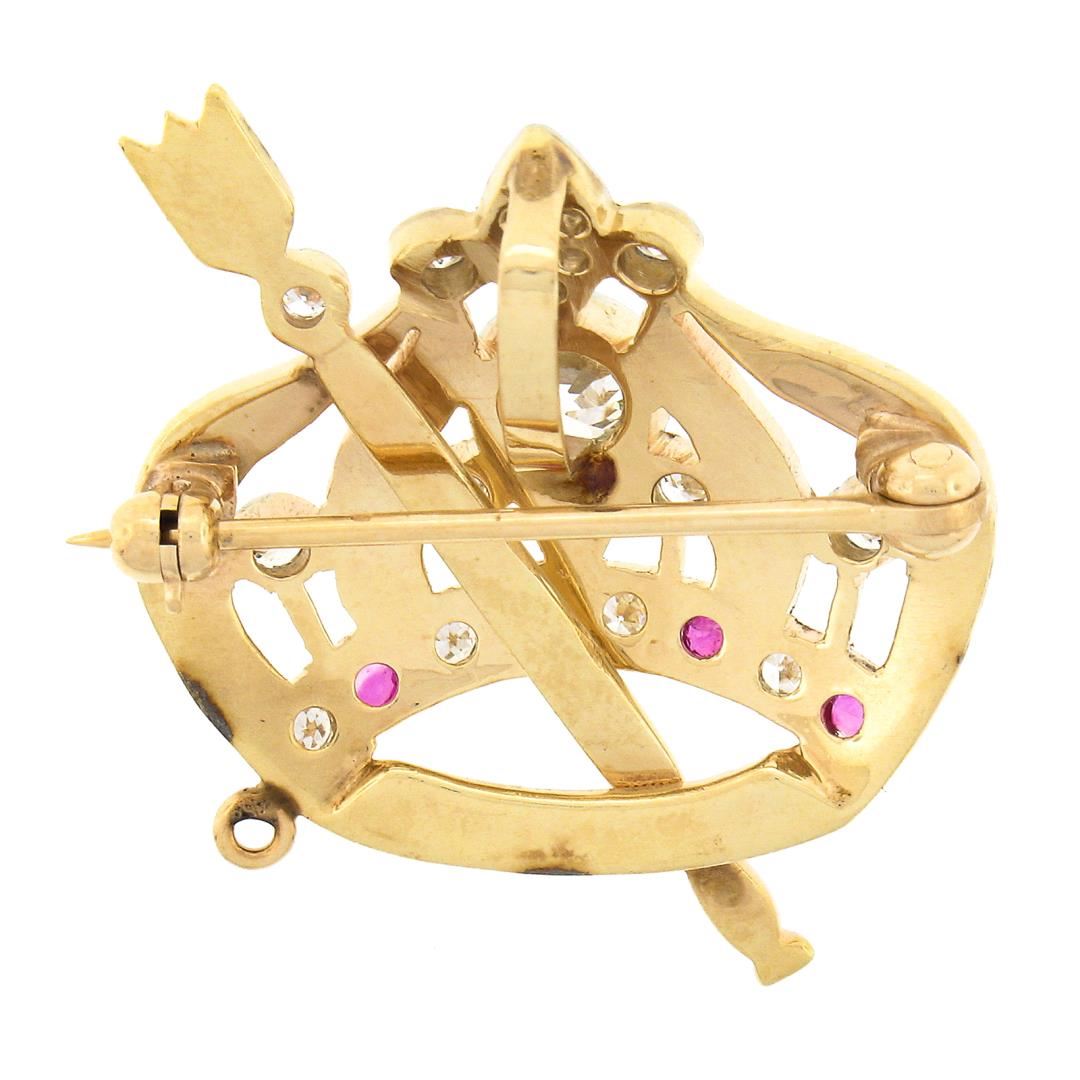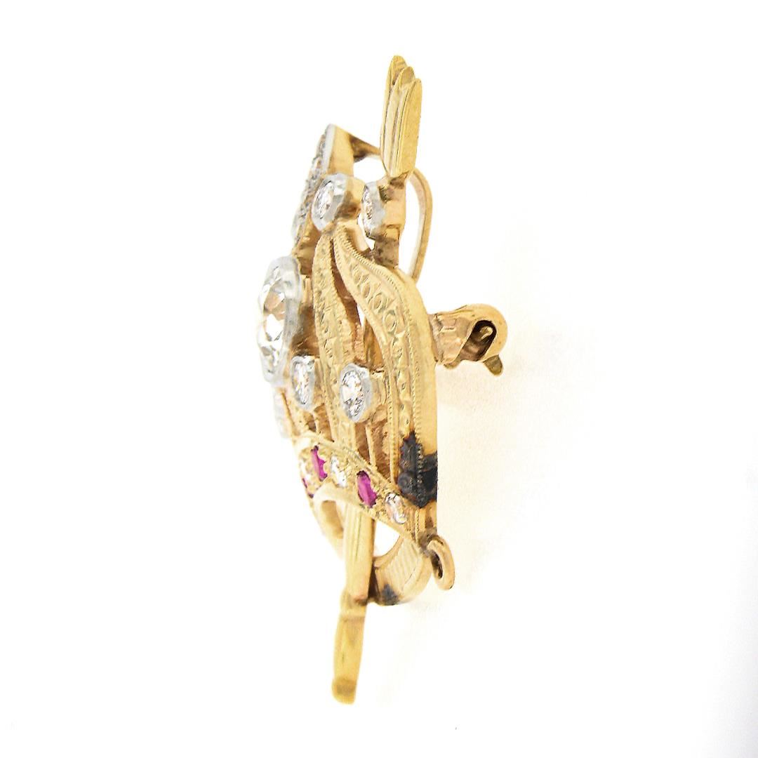 An antique solid 14k yellow & white gold brooch pendant, with 1 old European cut natural diamond (I/J - SI2 ; 0.63ct), 17 old single cut natural diamonds (H/I - VS2/SI2 ; 0.40ctw), and 4 old round cut natural rubies (0.08ctw). Measures 30.2x26.7mm and weighs a total of 7.32 grams.