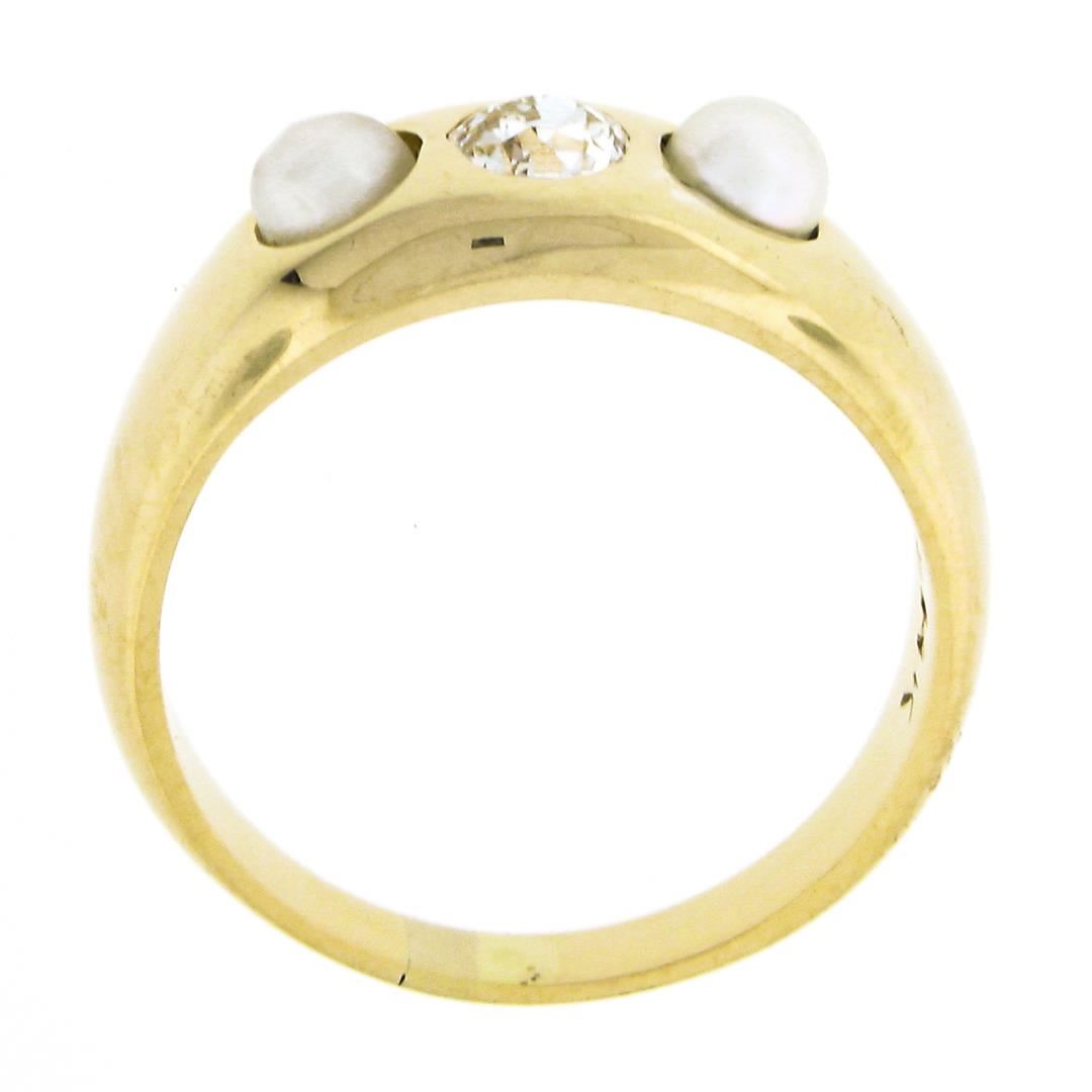 An antique solid 14k yellow gold ring, with 1 old european cut natural diamond (F - VS1 ; 0.28ctw), and 2 round shape cultured pearls (3.9mm each). The ring is size 7.0, weighs a total of 5.19 grams, and measures 7mm wide.