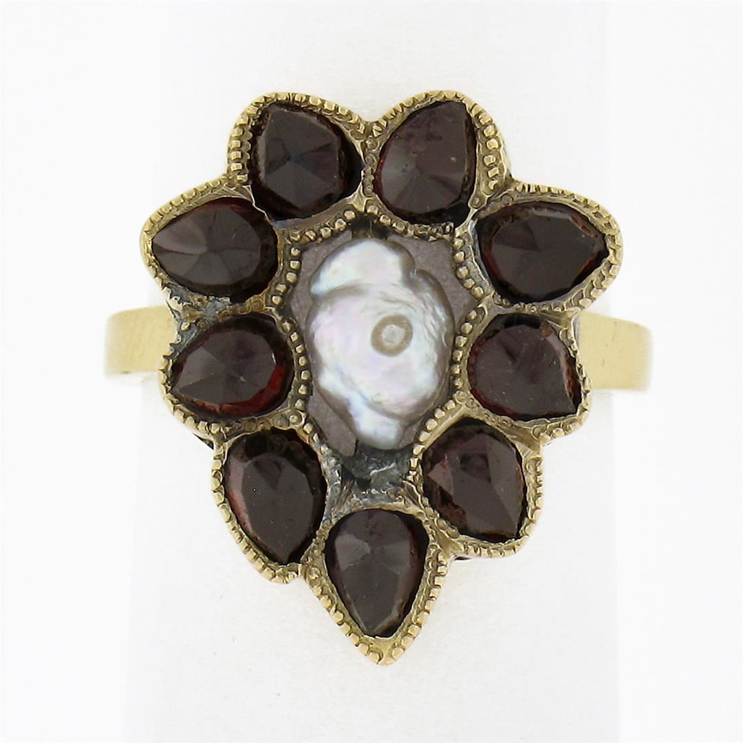 An antique solid 14k yellow gold ring, with baroque shaoe cultured pearl (1.80ctw), surrounded with a halo of 9 old rose cut natural garnets (6.5x4.9mm ). The ring is size 3.5, weighs a total of 4.21 grams, and measures 17.65mm wide.