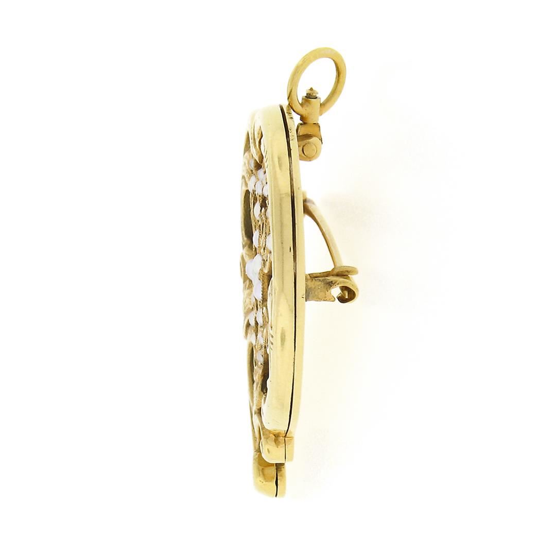 An antique solid 14k yellow gold brooch pendant. with unique shape natural turquoise, and 22 round shape seed pearls (1.0mm to 1.8mm each). Measures 32.60x25.65mm and weighs a total of 9.36 grams.