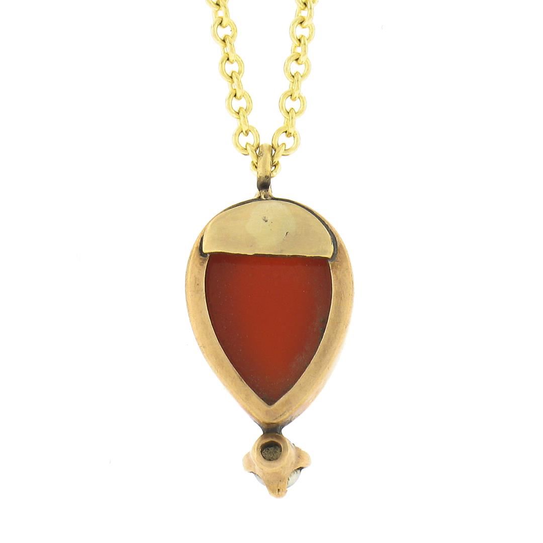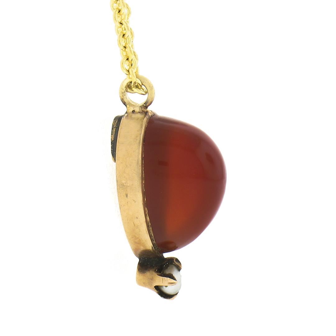 an antique solid 14k yellow gold pendant necklace, with 1 pear cabochon cut natural carnelian (10x6.9mm), and 1 round shape cultured seed pearl (2.25mm ). Adjustable 16 or 18 inch cable link chain, 3.24 grams total weight, pendant measures 16.15x7.7mm.