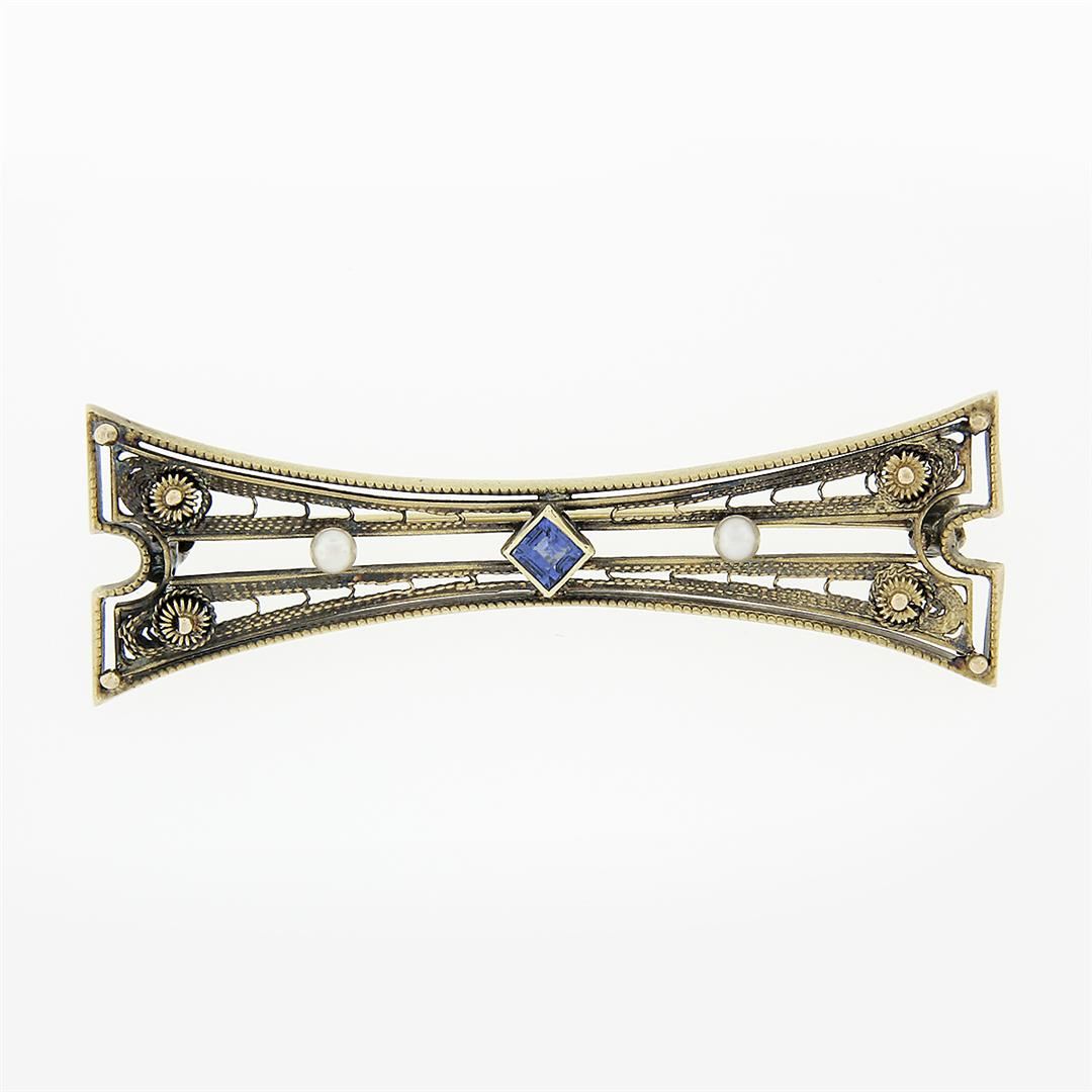 An antique solid 14k yellow gold bar pin brooch, with 1 square step cut natural montana sapphire (2.7mm), and 2 round shape cultured seed pearls (2.05mm). Measures 13.37x39.87mm and weighs a total of 2.68 grams.