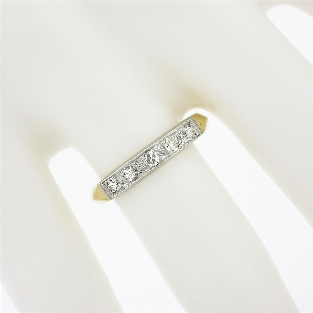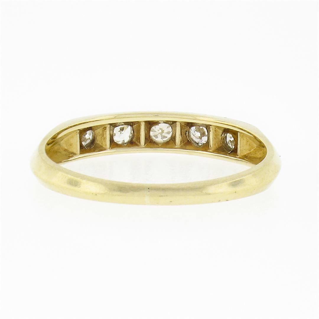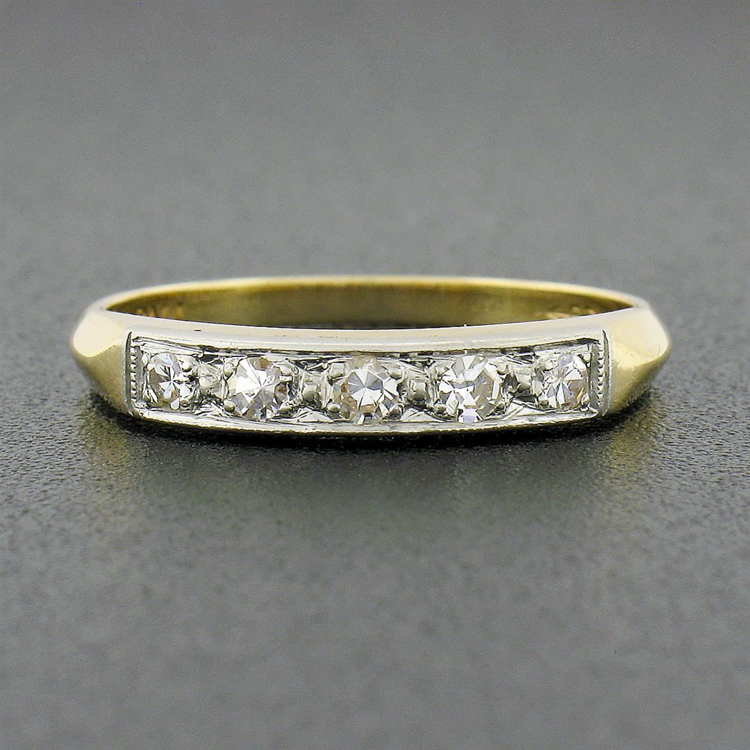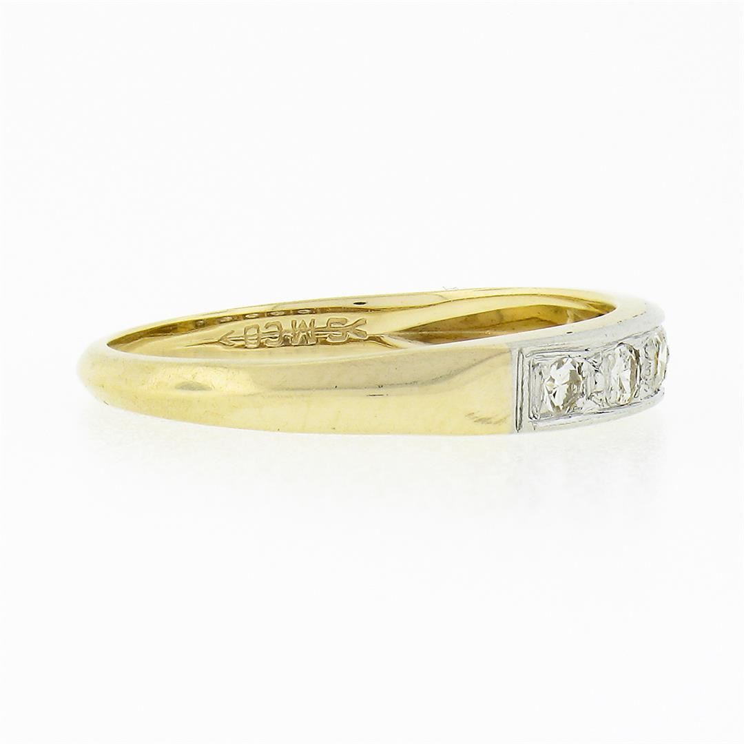 An antique slid 14k yellow gold and palladium band ring, with 5 old single cut natural diamonds (G/H - VS1/VS2 ; 0.20ctw). The ring is size 6.5, weighs a total of 1.80 grams, and measures 3.40mm wide.