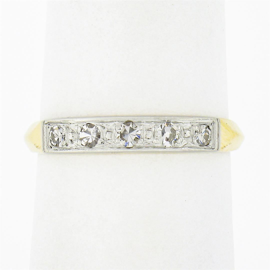 An antique slid 14k yellow gold and palladium band ring, with 5 old single cut natural diamonds (G/H - VS1/VS2 ; 0.20ctw). The ring is size 6.5, weighs a total of 1.80 grams, and measures 3.40mm wide.