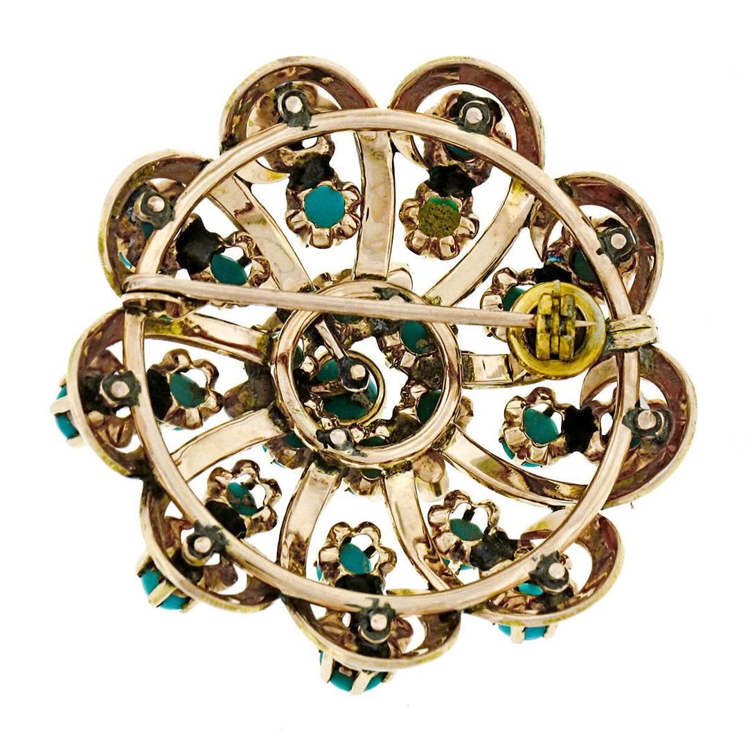 An antique 14kt rose gold flower brooch with 25 round cabochon turquoise stones measuring from 3.1mm to 5.7mm in diameter prong set among round and swirling white enamel accents. Measures 35.3mm in diameter and weighs a total of 12.08 grams.