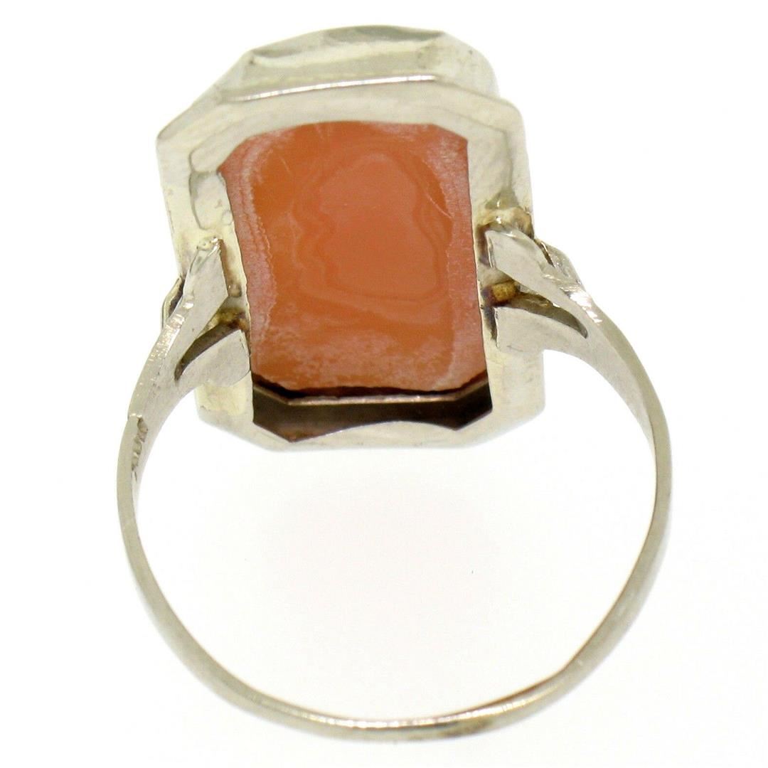 An excellent condition antique 14kt white gold ring with a carved shell cameo. The ring is size 6.5, weighs a total of 3.3 grams, and measures 22.0mm wide.