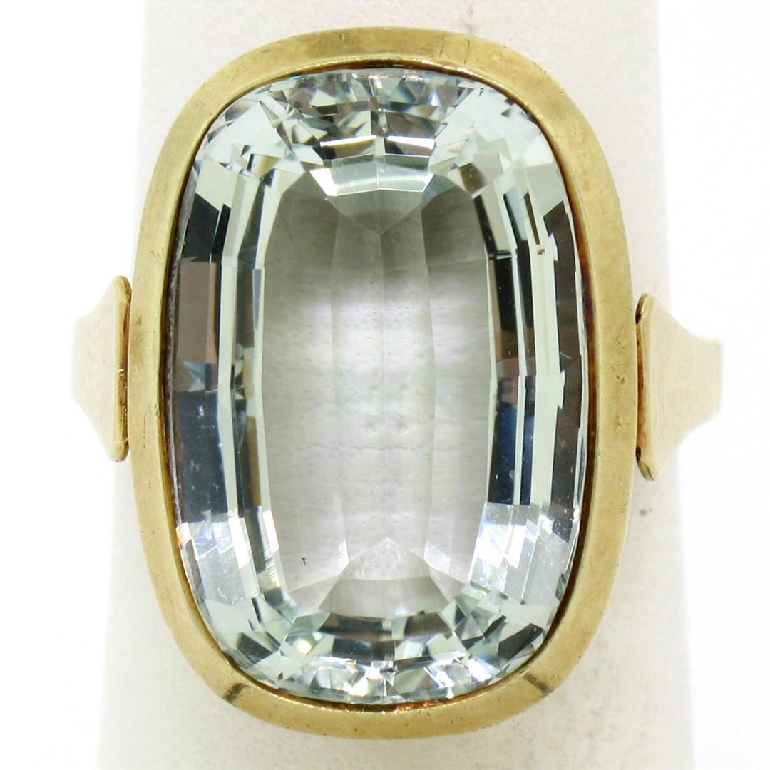 A large antique 14kt yellow gold ring featuring a GIA certified oval cut Aquamarine weighing approximately 8.57ct. The ring is size 6.0, weighs a total of 7.72 grams, and measures 20.30mm wide. Comes with original GIA certification for the aquamarine.