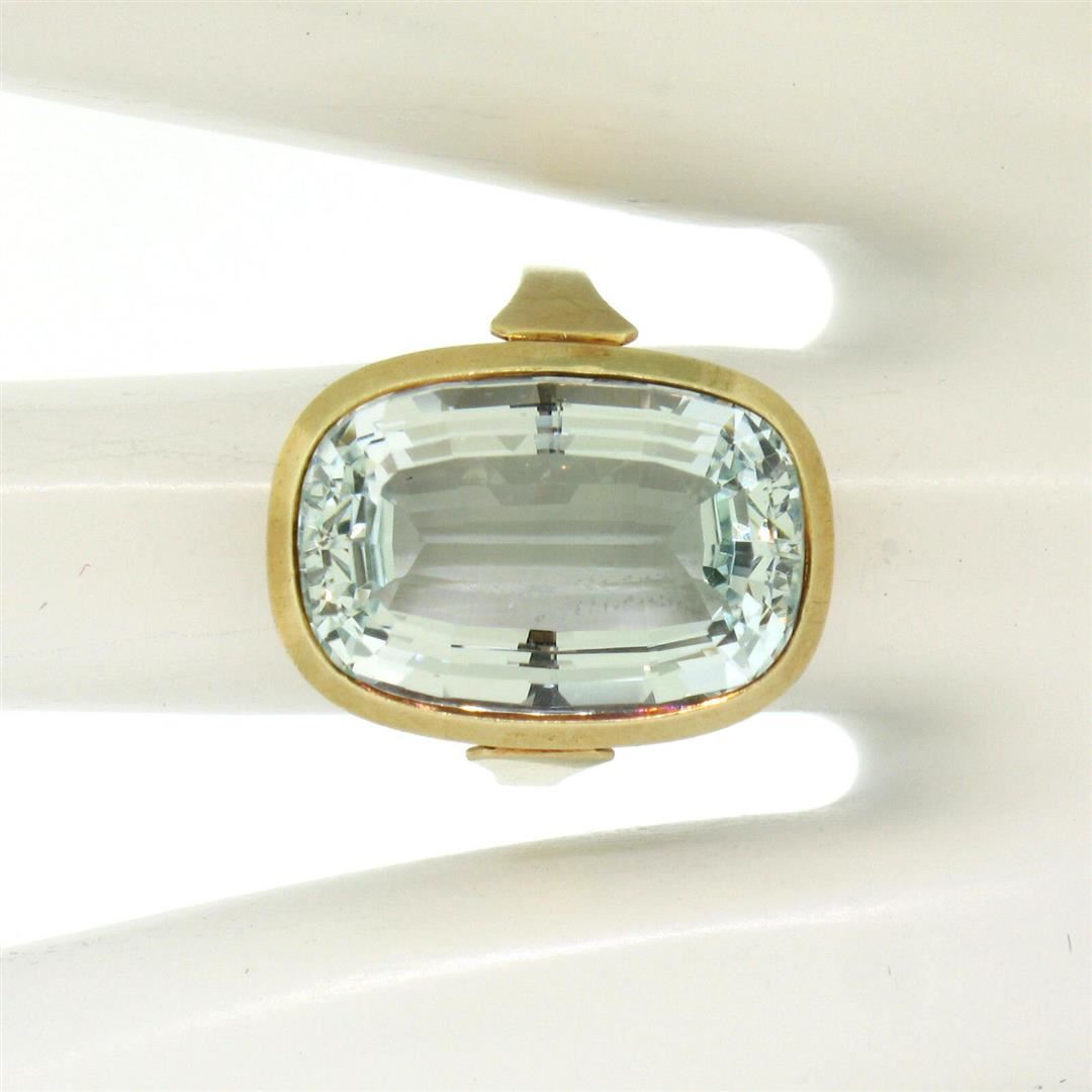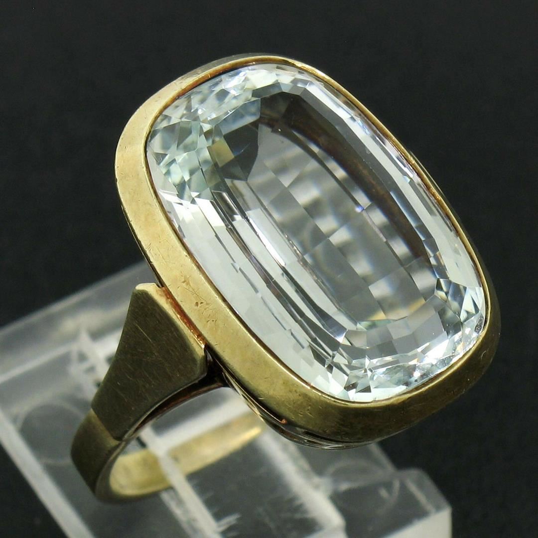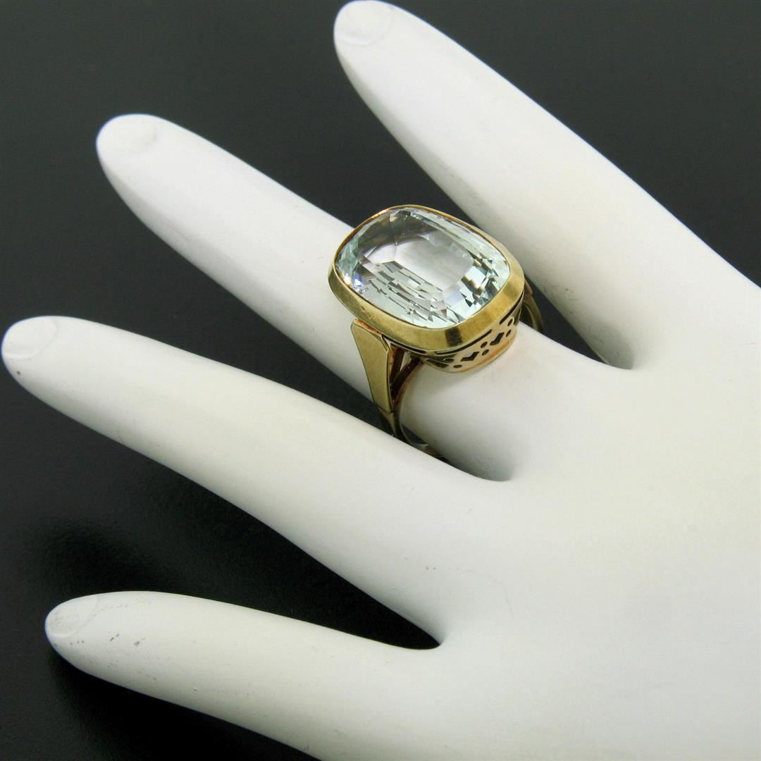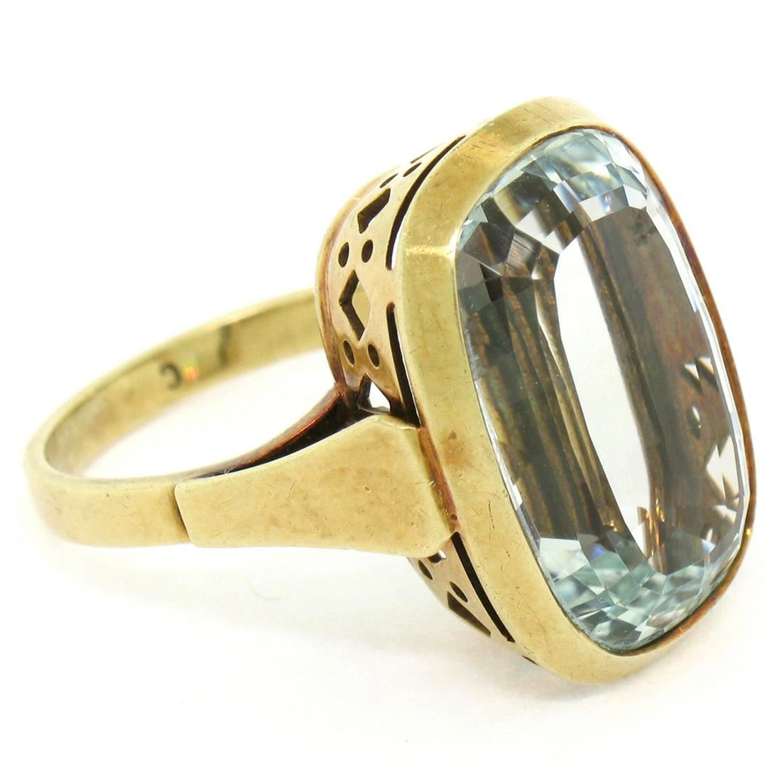 A large antique 14kt yellow gold ring featuring a GIA certified oval cut Aquamarine weighing approximately 8.57ct. The ring is size 6.0, weighs a total of 7.72 grams, and measures 20.30mm wide. Comes with original GIA certification for the aquamarine.