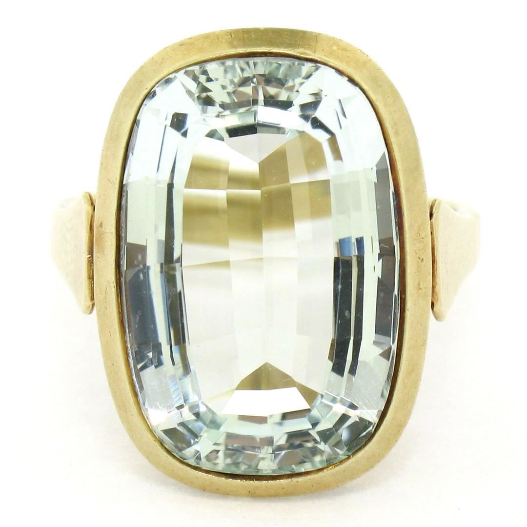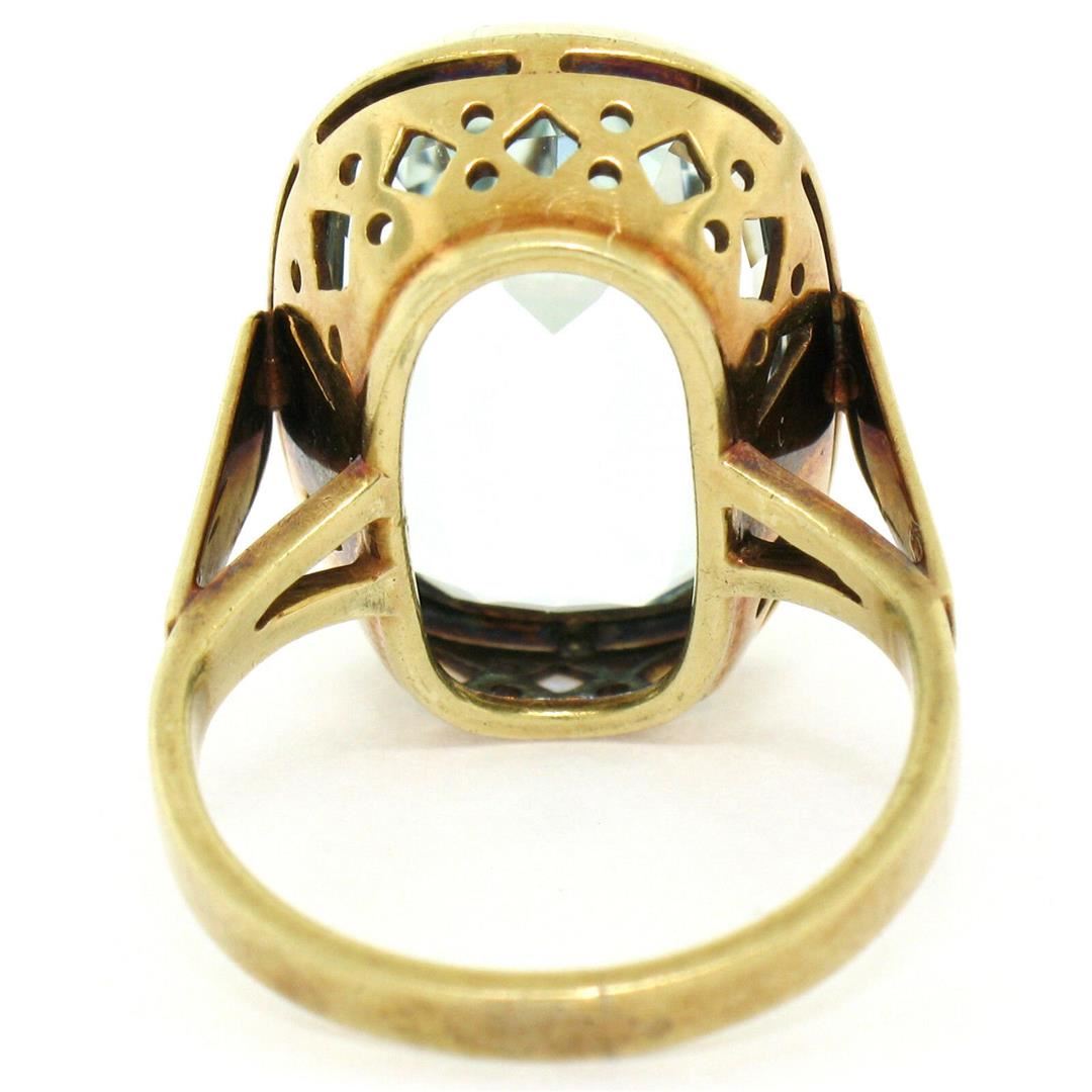 A large antique 14kt yellow gold ring featuring a GIA certified oval cut Aquamarine weighing approximately 8.57ct. The ring is size 6.0, weighs a total of 7.72 grams, and measures 20.30mm wide. Comes with original GIA certification for the aquamarine.