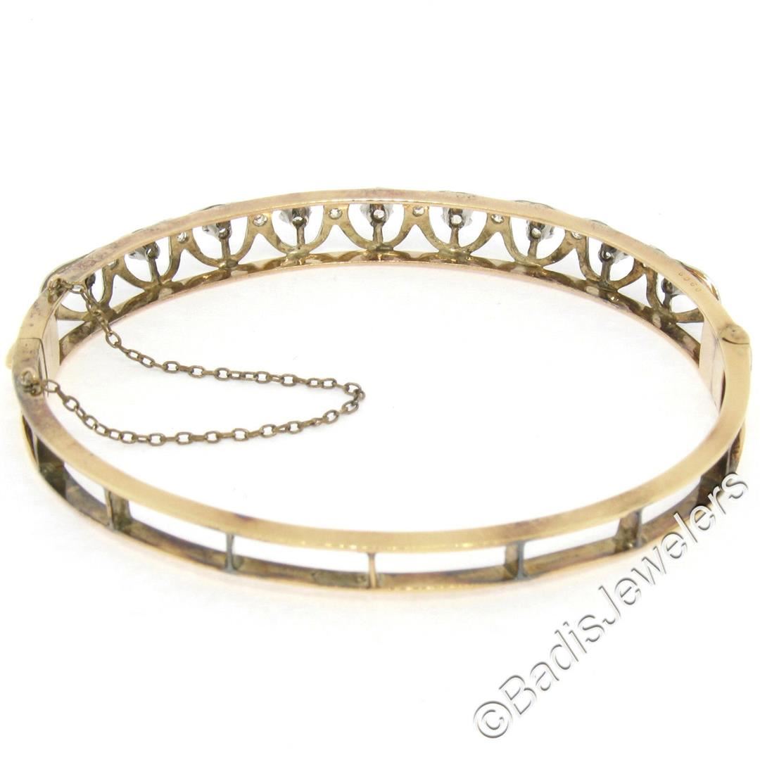 An antique 14kt yellow gold and platinum bangle bracelet with 1.00ctw of old mine and single cut diamonds (G to I - VS1/SI1). It weighs a total of 13.79 grams, measures 8.4mm wide, and measures 7.5 inches in length.