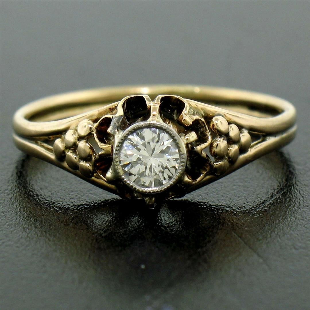 An antique 14kt yellow gold ring featuring a 0.30ct round brilliant diamond (F - VVS2) set in a 14kt white gold milgrain bezel. The ring is size 5.5, weighs a total of 1.79 grams, and measures 6.67mm wide.