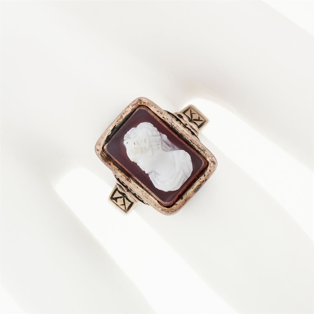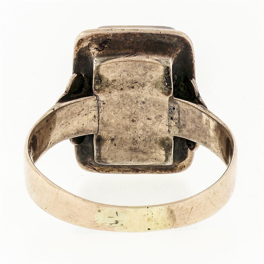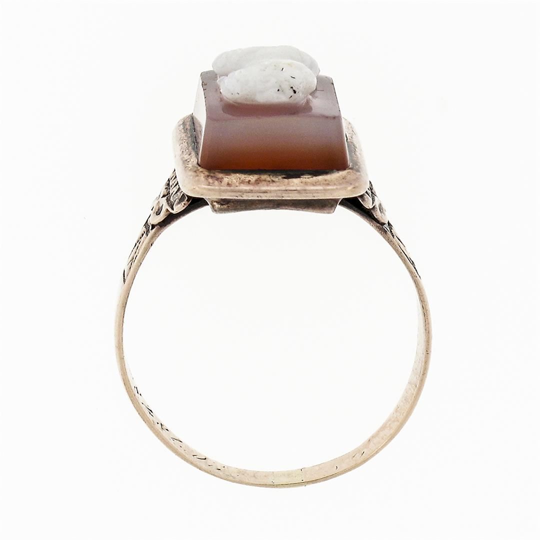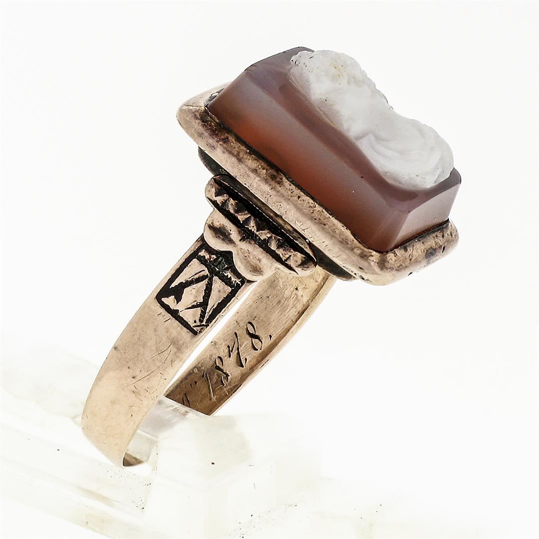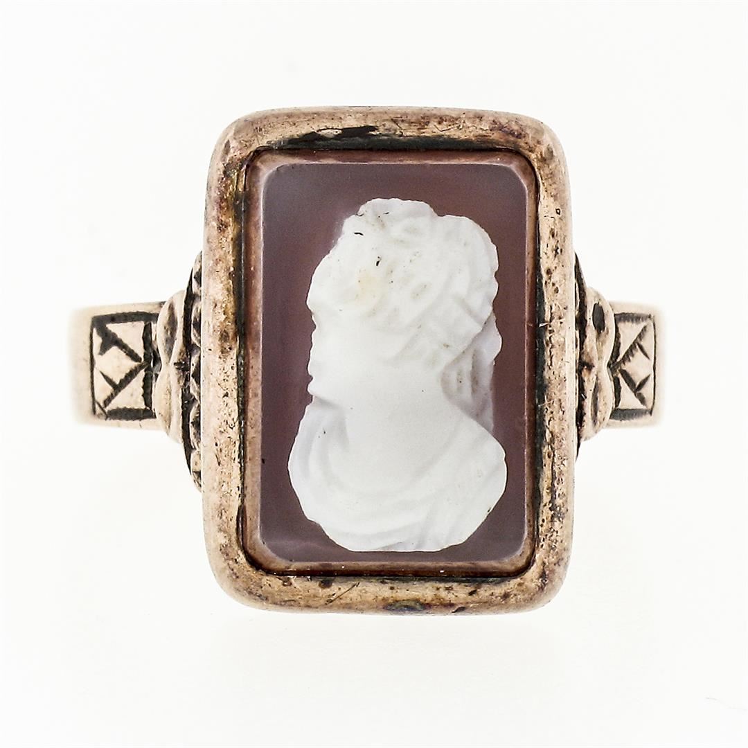 An antique solid 14k rose gold ring, with 1 rectangular hand carved cameo natural agate hardstone (11.97x8.02mm). The ring is size 6.0, weighs a total of 3.63 grams, and measures 14.16mm wide.