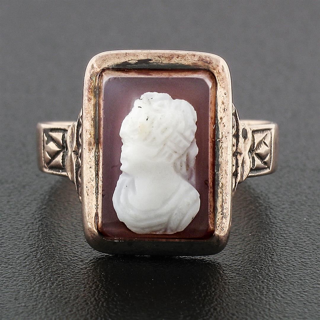 An antique solid 14k rose gold ring, with 1 rectangular hand carved cameo natural agate hardstone (11.97x8.02mm). The ring is size 6.0, weighs a total of 3.63 grams, and measures 14.16mm wide.
