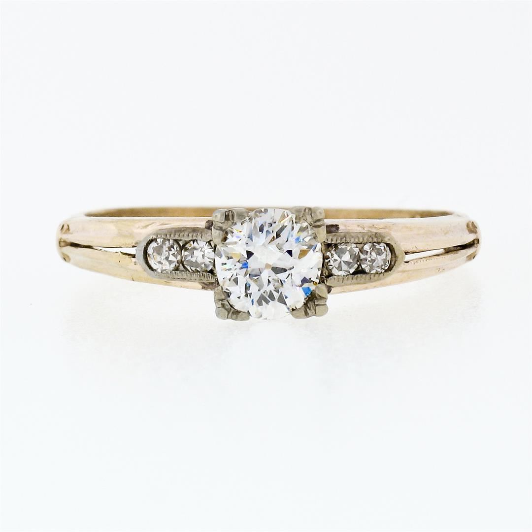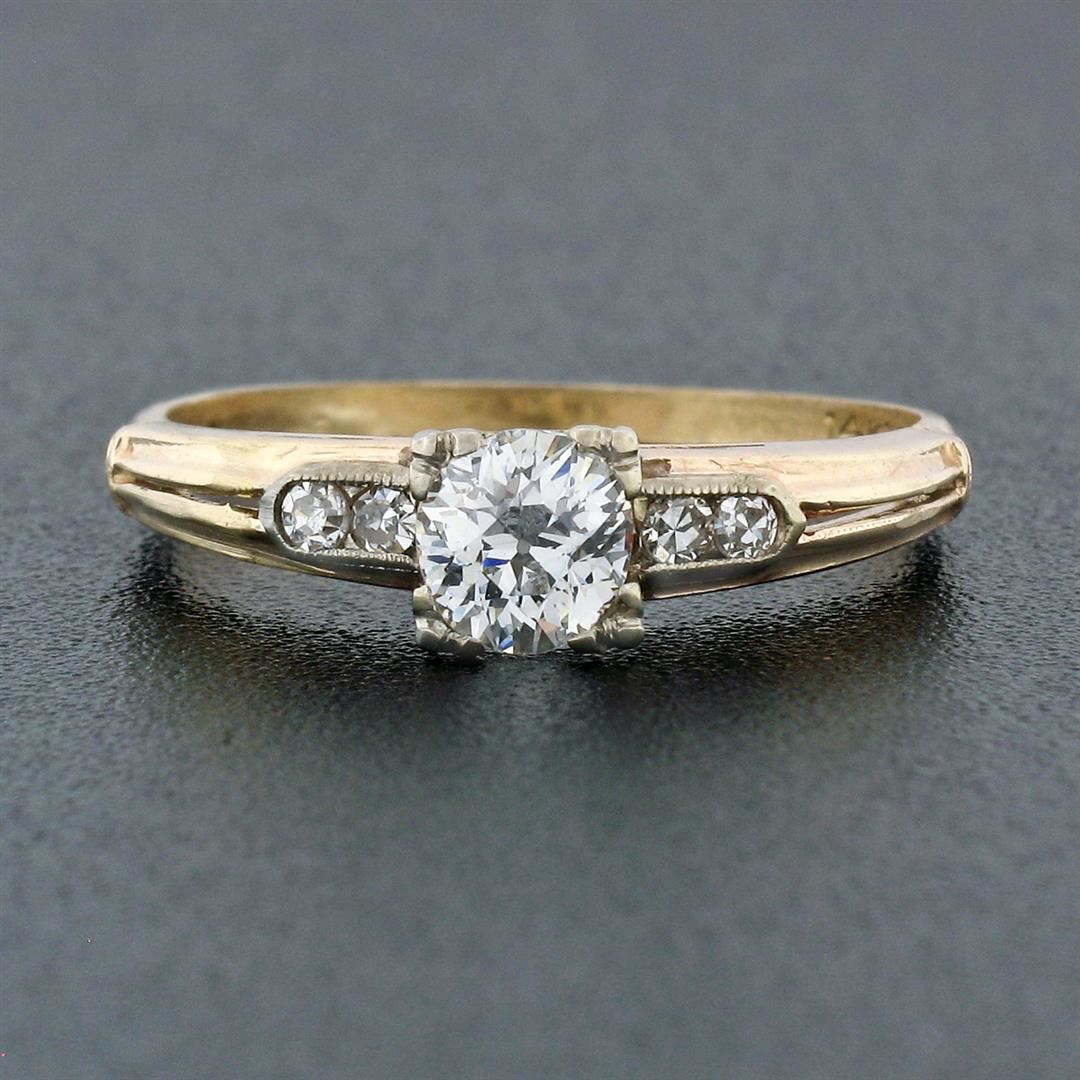 An antique solid 18k white gold & 14k yellow gold solitaire ring, featuring 1 old european cut natrual diamond (G - VS2; 0.42ct), and 4 old single cut natural diamonds (F/G - VS1/VS2 ; 0.08ctw). The ring is size 6, weighs a total of 1.65 grams, and measures 4.90mm wide.