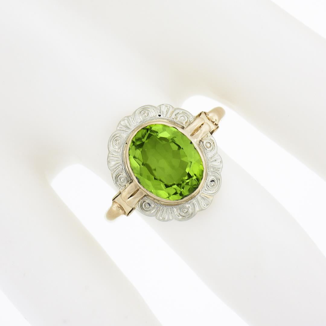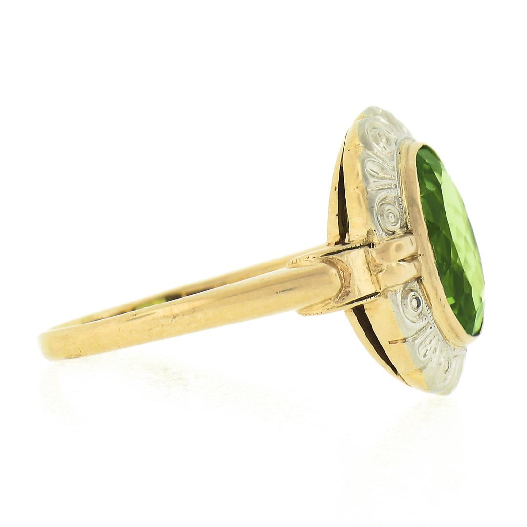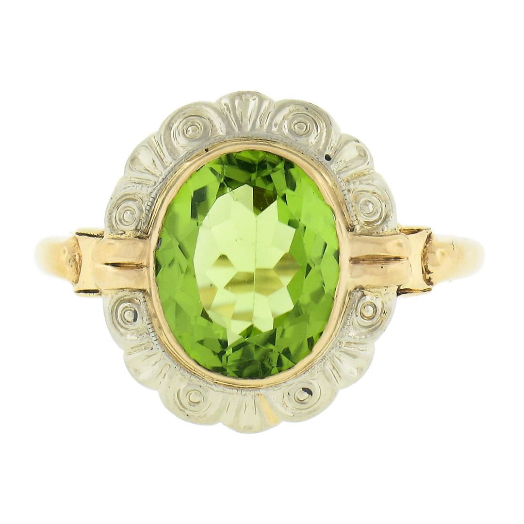 An antique solid 18k yellow & white gold solitaire ring, with 1 oval cut natural peridot ( 2.75ct). The ring is size 8.5, weighs a total of 3.54 grams, and measures 15.4mm wide.