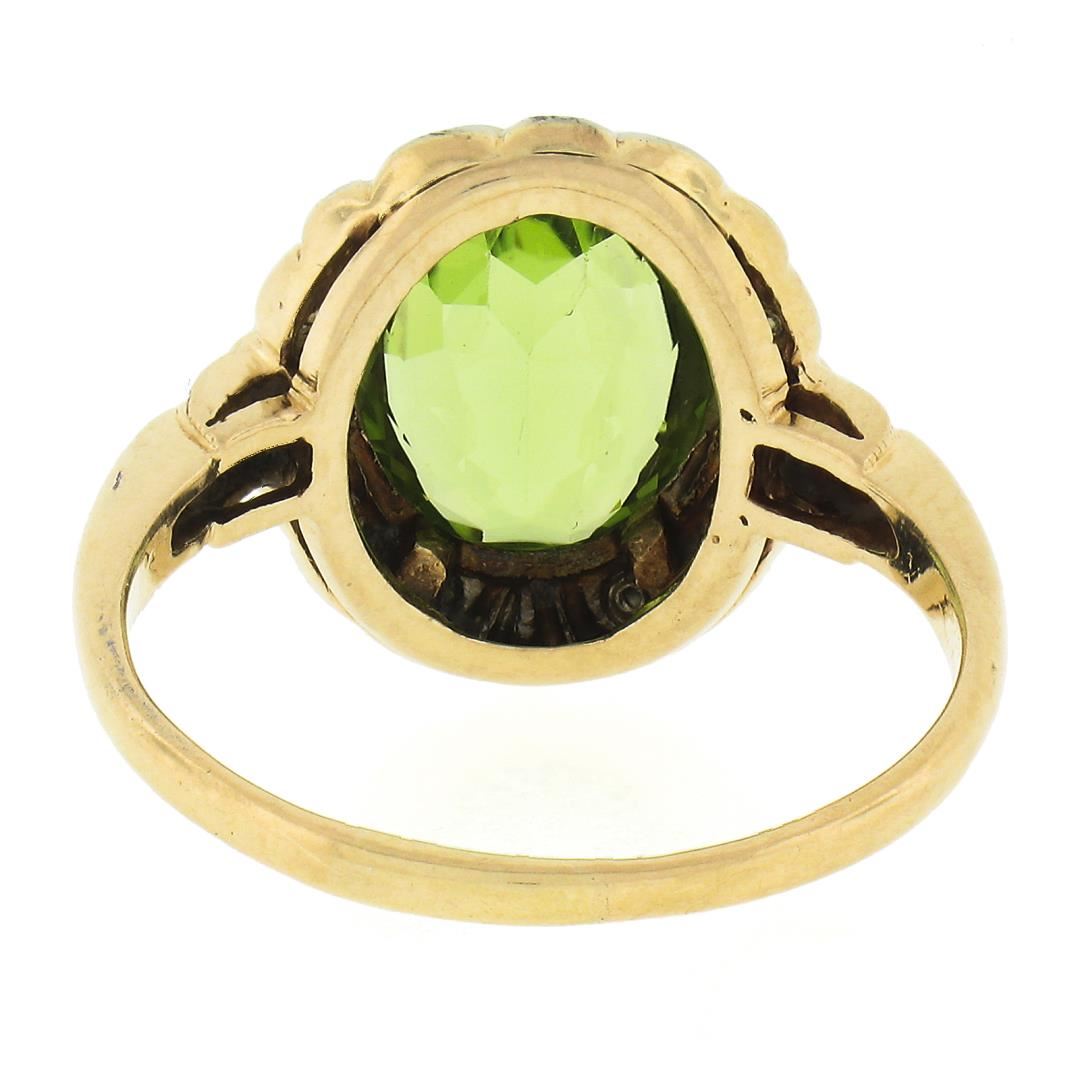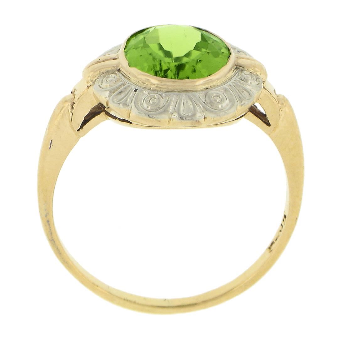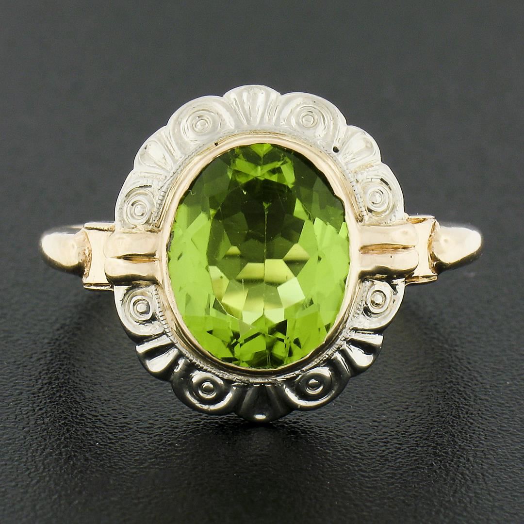 An antique solid 18k yellow & white gold solitaire ring, with 1 oval cut natural peridot ( 2.75ct). The ring is size 8.5, weighs a total of 3.54 grams, and measures 15.4mm wide.