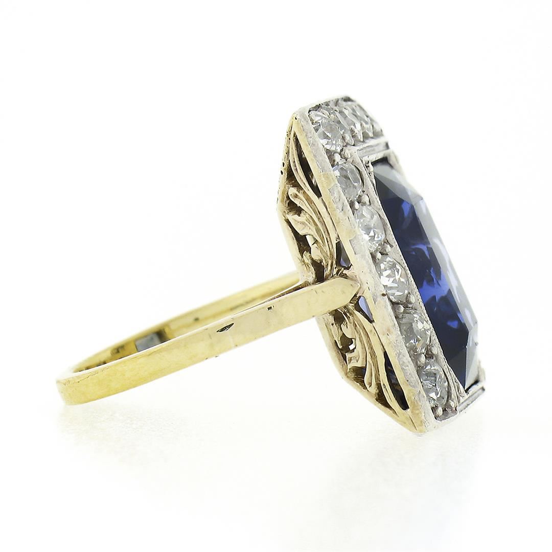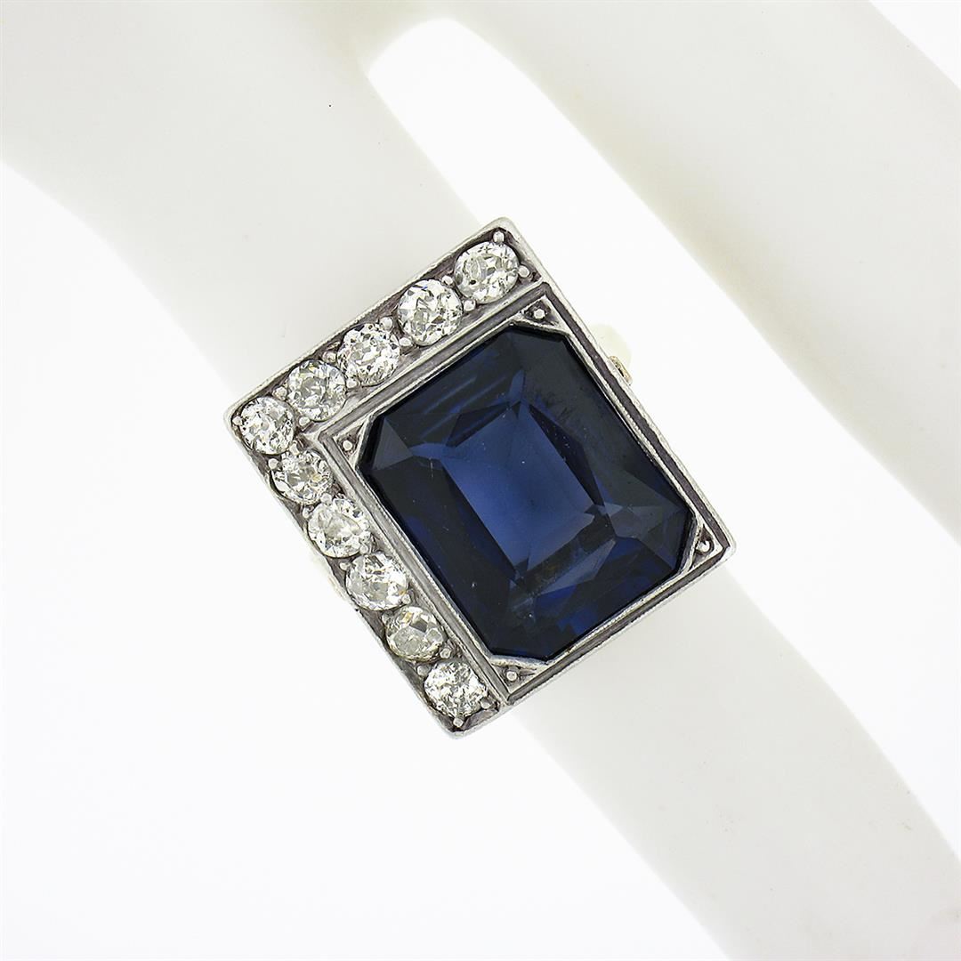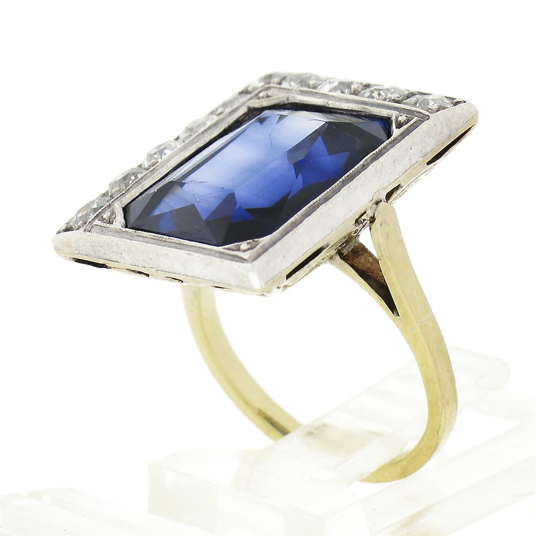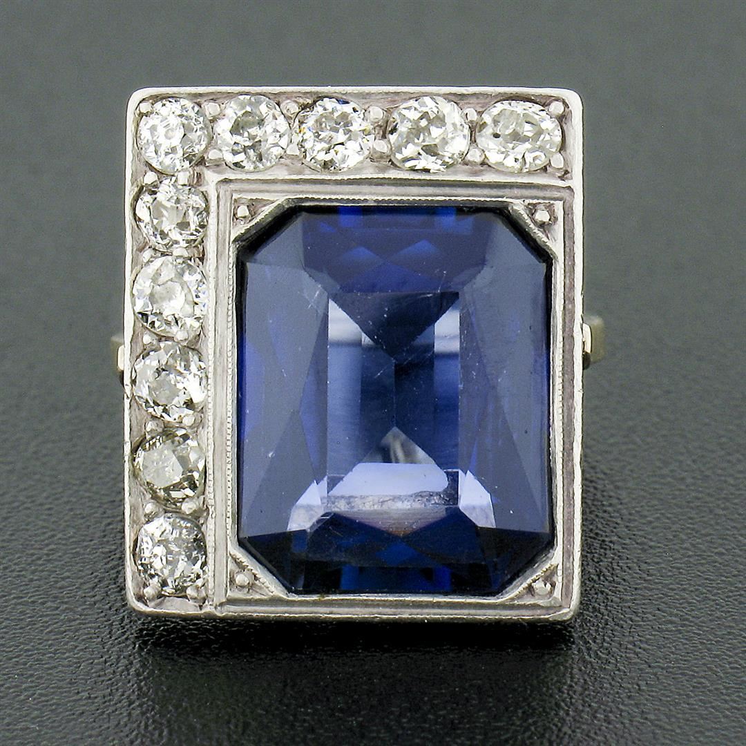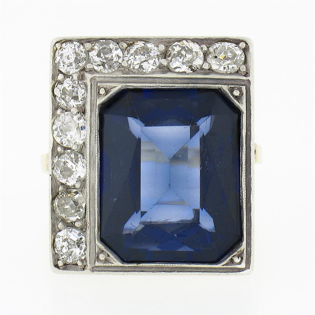 An antique solid 18k yellow and white gold platter ring, with 1 rectangular shape blue stone (13.10x10.60mm ), and 10 old mine cut natural diamonds (G/I - VS2/SI2 ; 1.10ctw). The ring is size 4.0, weighs a total of 7.08 grams, and measures 18.30mm wide.