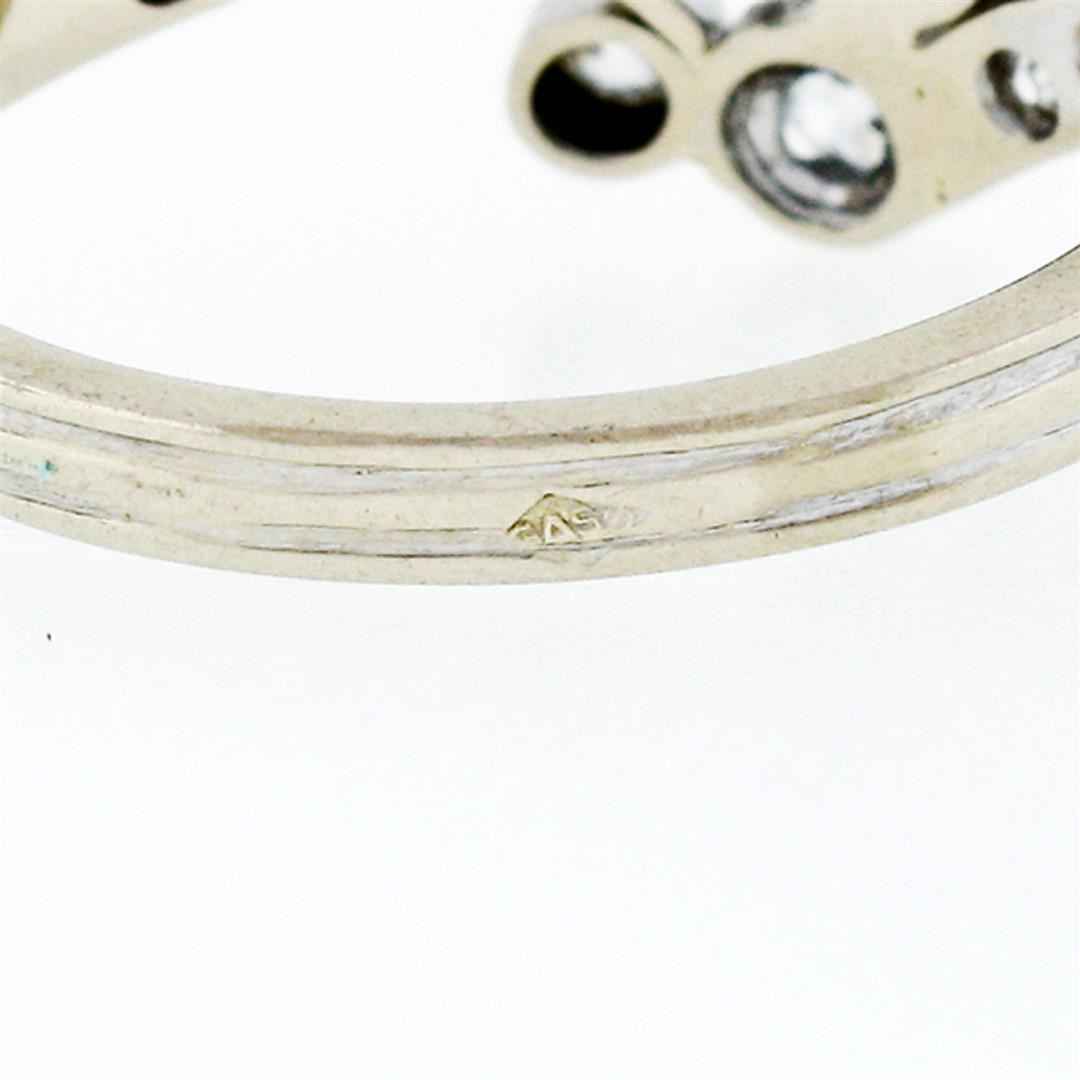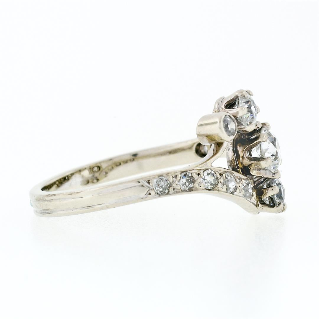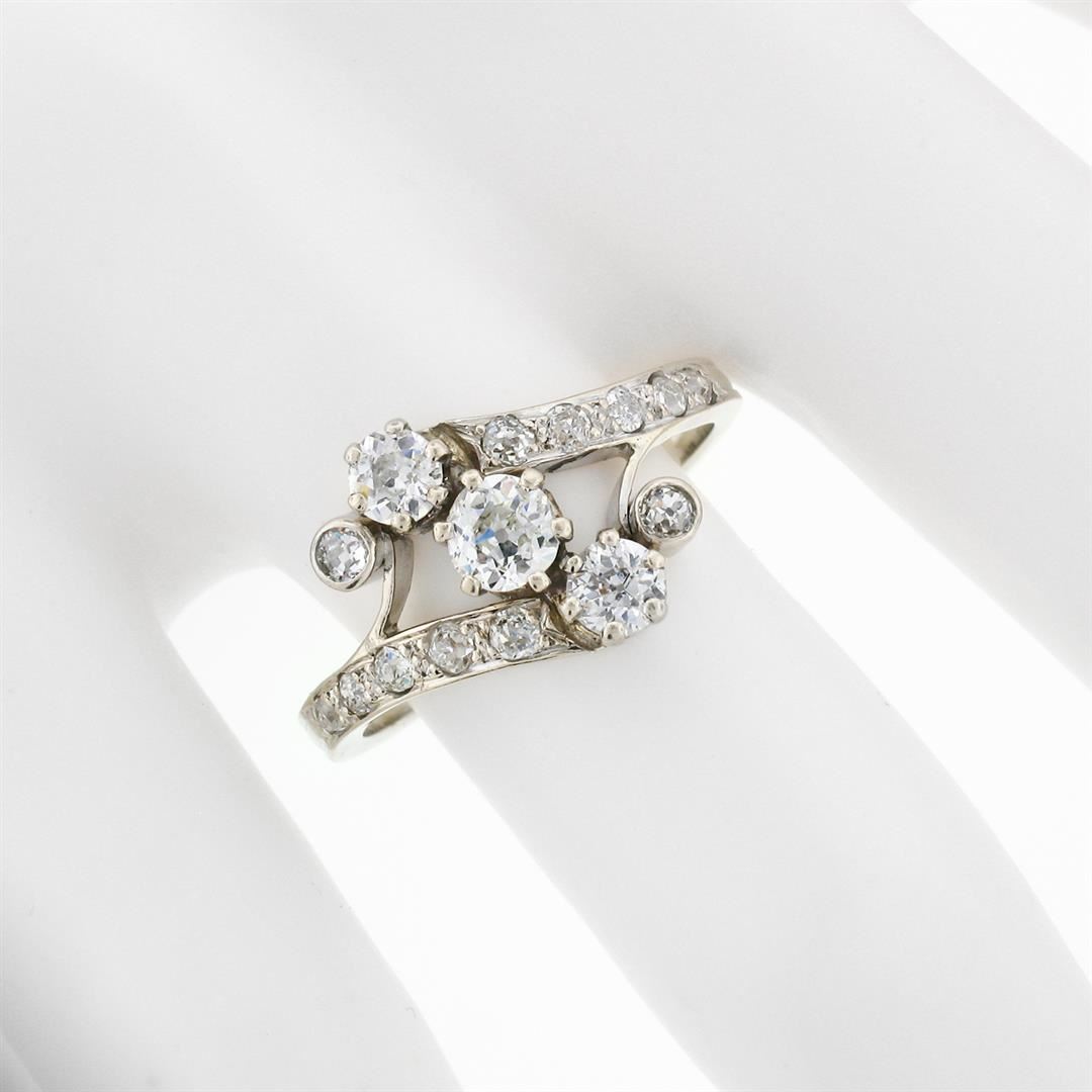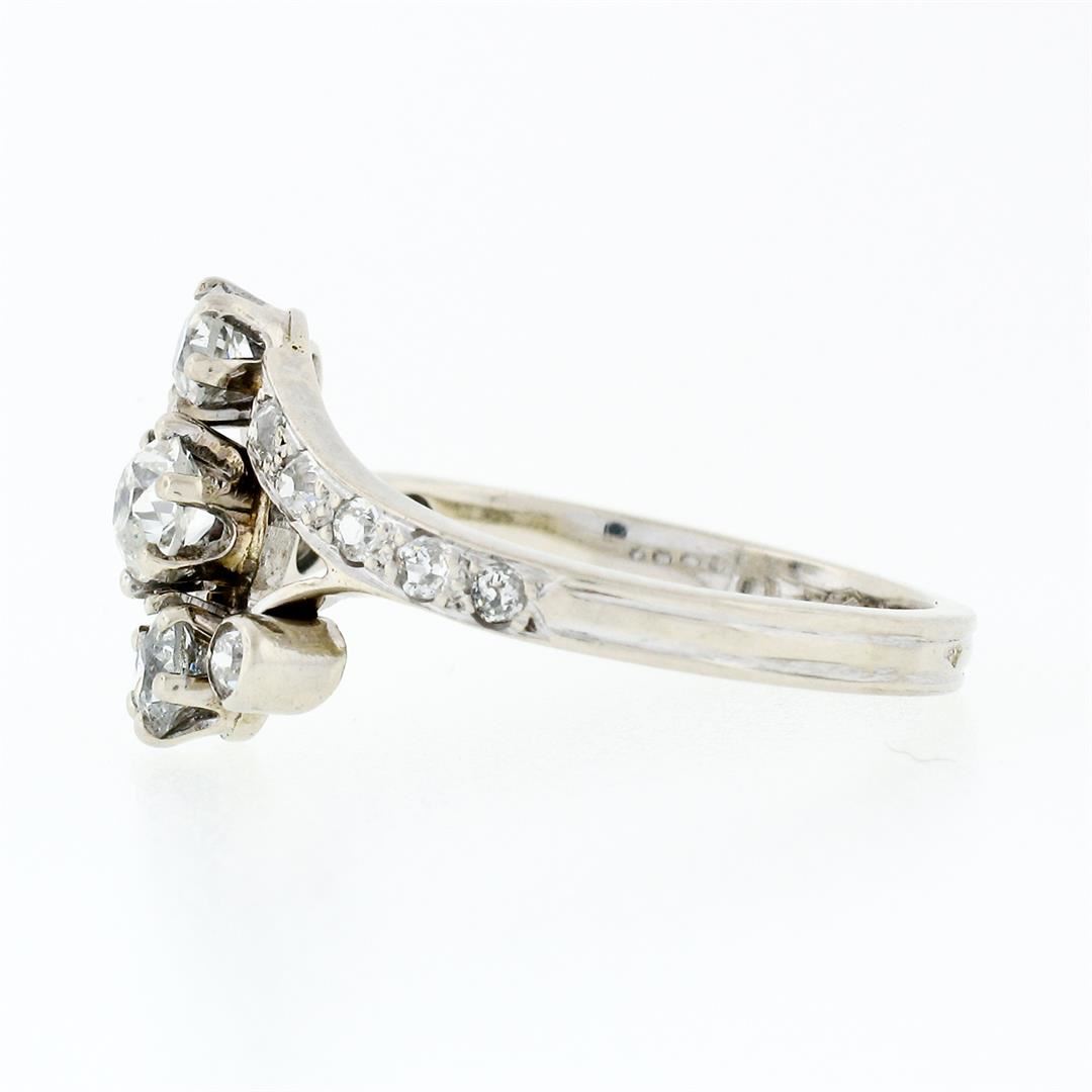 An antique solid 18k white gold bypass ring, with 3 old european cut natural diamonds (G/H - VS2-SI2 ; 0.75ctw), and 12 old european and mine cut natural diamonds (G-I - VS1-SI1; 0.36ctw ). The ring is size 8, weighs a total of 3.80 grams, and measures 12.25mm wide.